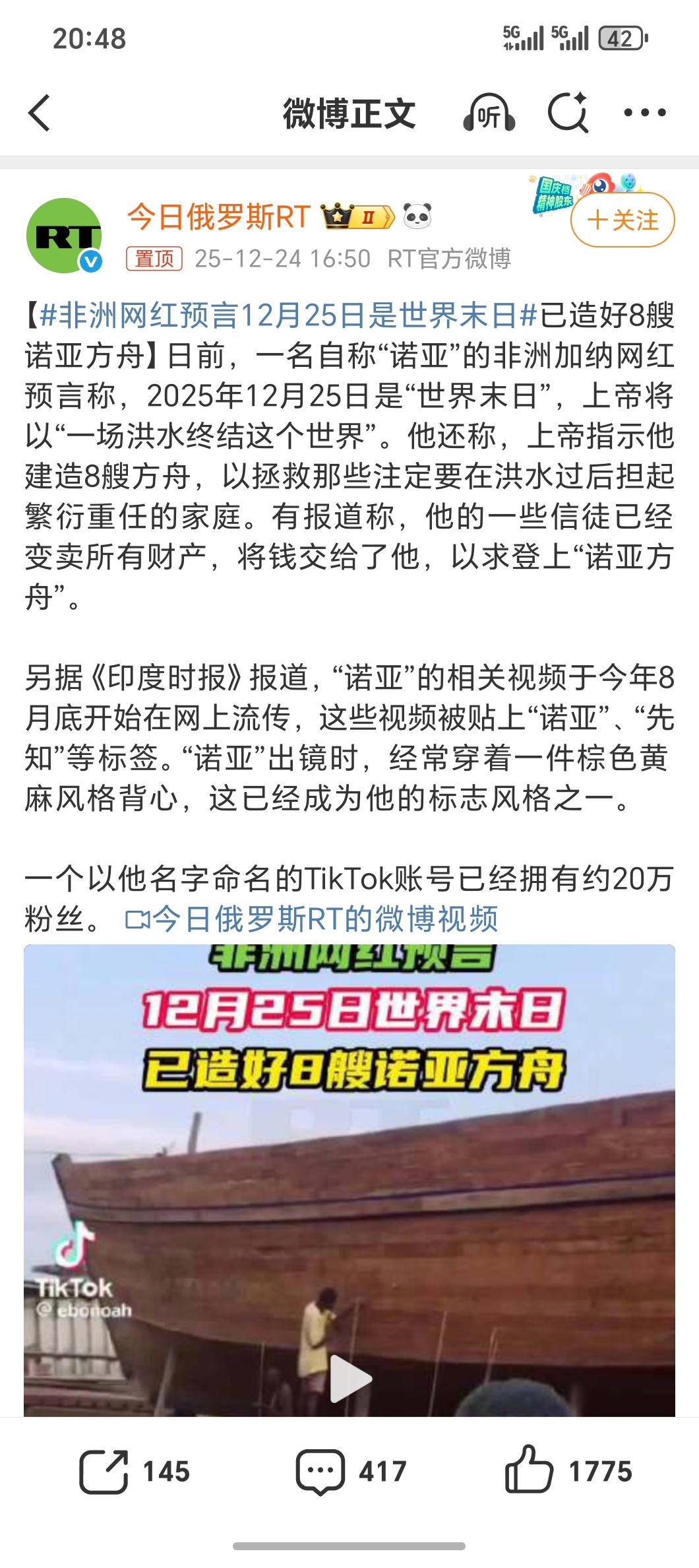非洲网红预言12月25日是世界末日好好好!又来世界末日是吧其实,我们经历过2002年世界末日的人都知道,现在的世界是重启的新社会,这个秘密我们一直保守到现在