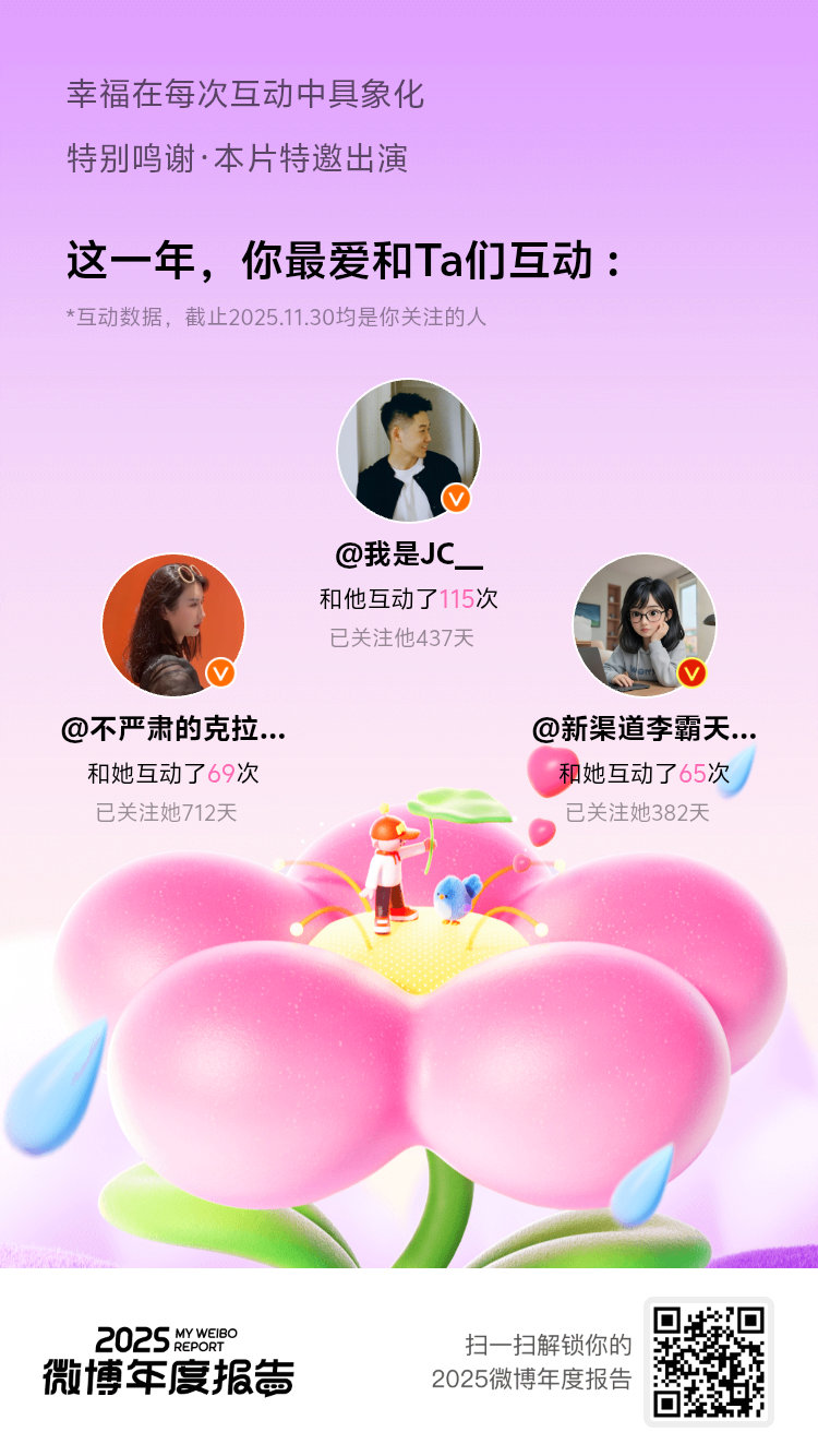 微博年度报告你们是我刷微博时最安心的存在,没错!你们就是我的年度最爱!好的内容值得反复回味,期待新一年你们带来更多惊喜!2025微博年度报告