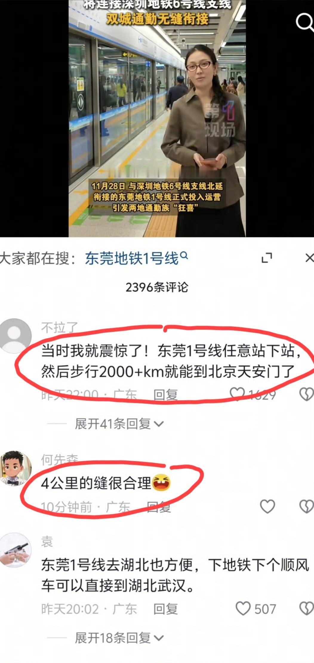 东莞地铁一号线开通,有媒体报道称“实现了和深圳双城通勤的无缝衔接”。此话一出,引得评论区网友一顿群槽,因为当地网友都知道,东莞一号线和深圳六号线两个站点的距离足足有4公里多。 有网友套用雷军的话术评论道:我当时就被震惊了,东莞1号线任意站下车,然后步行2000+km就能到北京天安门了! 也有网友调侃道:4公里的缝很合理! …… 有影响力的媒体尚且如此,更何况自媒体。这样长久下去,该如何是好哦?