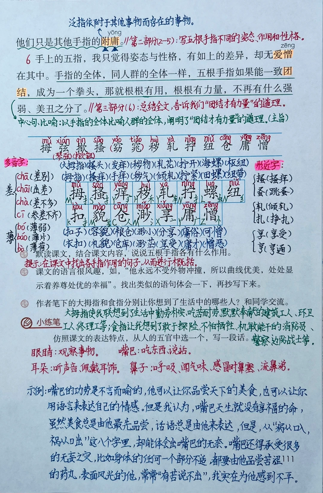 4.能由文中的大拇指和食指想到生活中类似的人,懂得团结才有力量的道理。(重点)