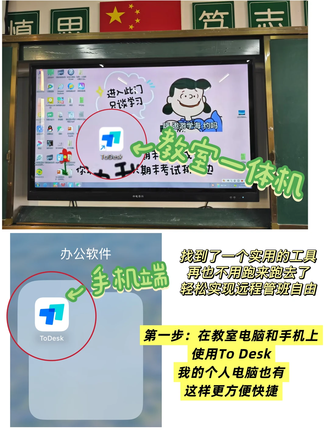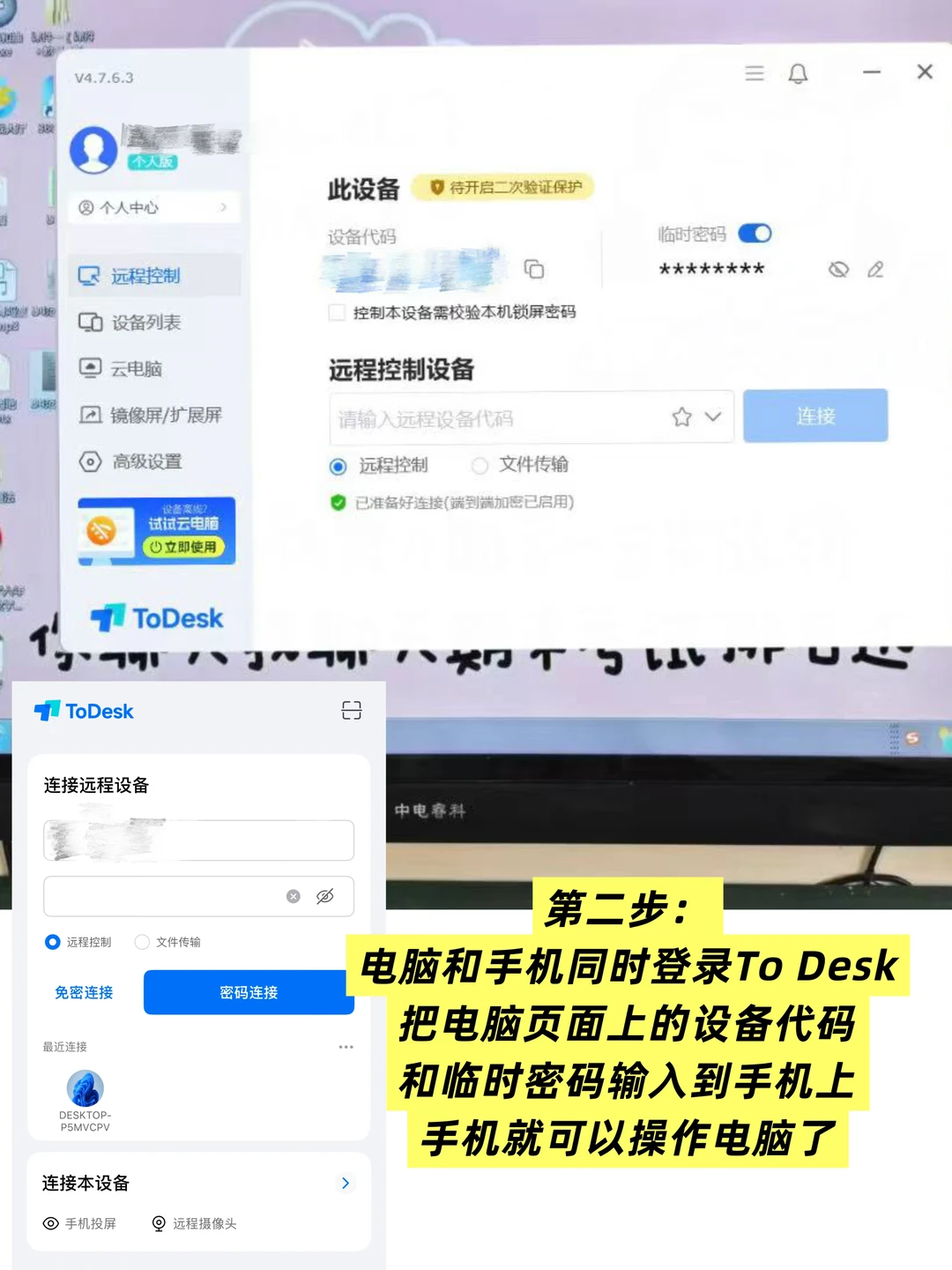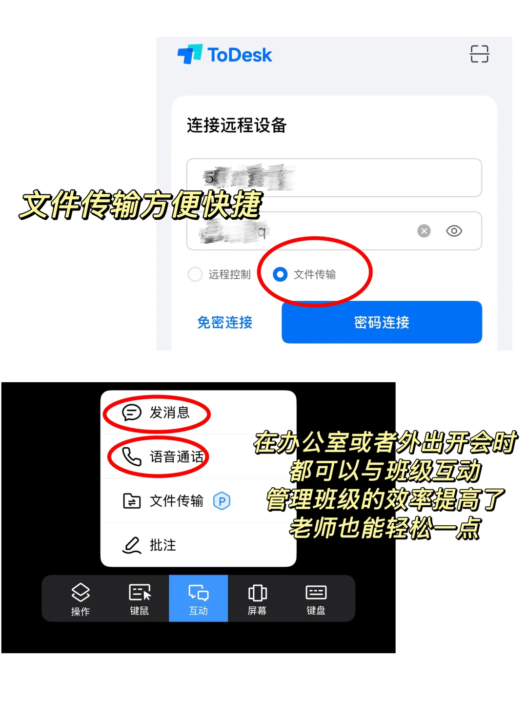 还好我发现了To Desk这个软件[黄金薯R]一个可以实现远程管理班级的好帮手。再也不用爬上爬下去布置任务了。💻只需要在电脑和手机同时登录,输入设备代码和密码,就可以实现远程操控了。