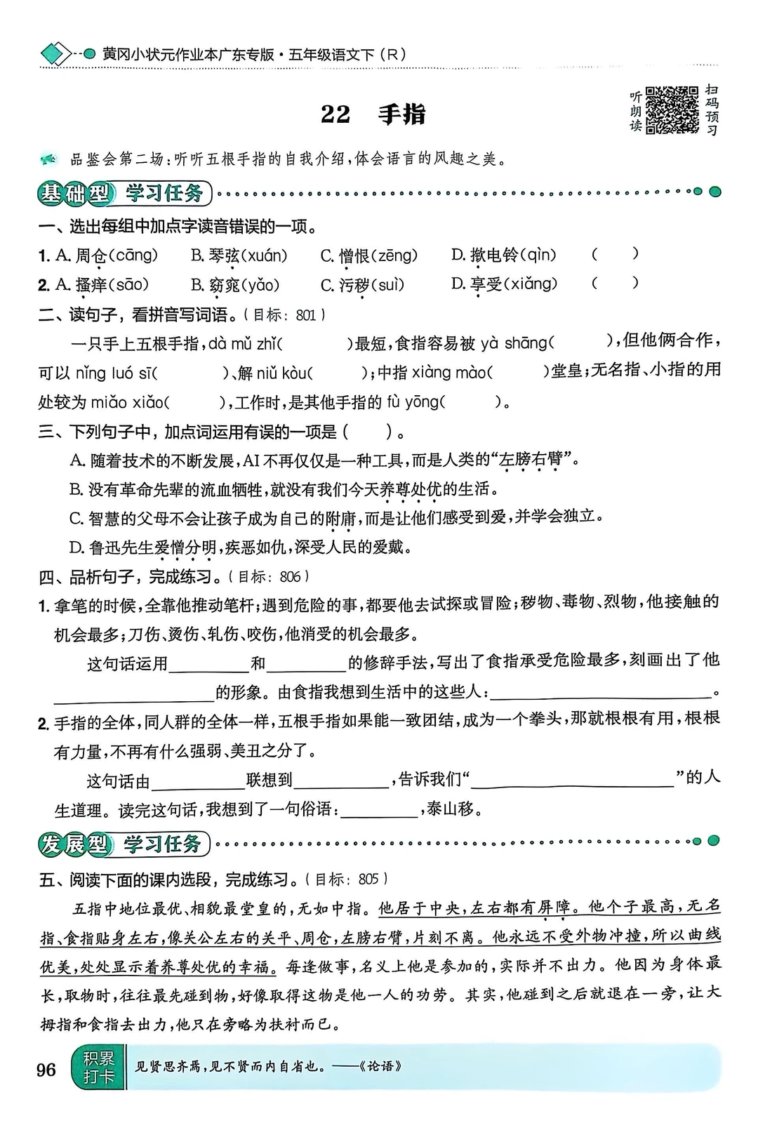 1.认识“拇、弦”等生字,会写“拇、搔”等字,会写“拇指、接触〞等词语。
