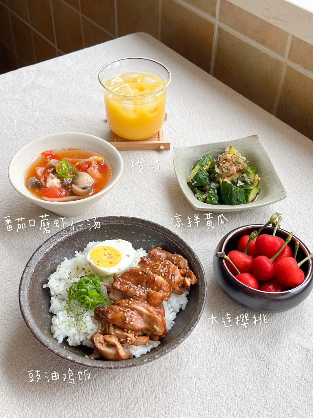 今日午餐: 豉油鸡饭🍱 凉拌黄瓜🥒 番茄口蘑虾仁汤🍅 橙汁🧃 端午节买的樱桃还剩最后一箱 早餐吃的自己做的巧克力烤麦片和酸奶 等吃完 估计好长时间都不想再见到它了 用两个琵琶腿做了豉油鸡饭 太香了! 不用额外加油 皮香肉滑 炒鸡嫩啊 我放了很多的小葱铺在锅底 吃的时候用小葱和汤汁拌着米饭 或者煮的时候多放点汤 煮粉也能好吃
