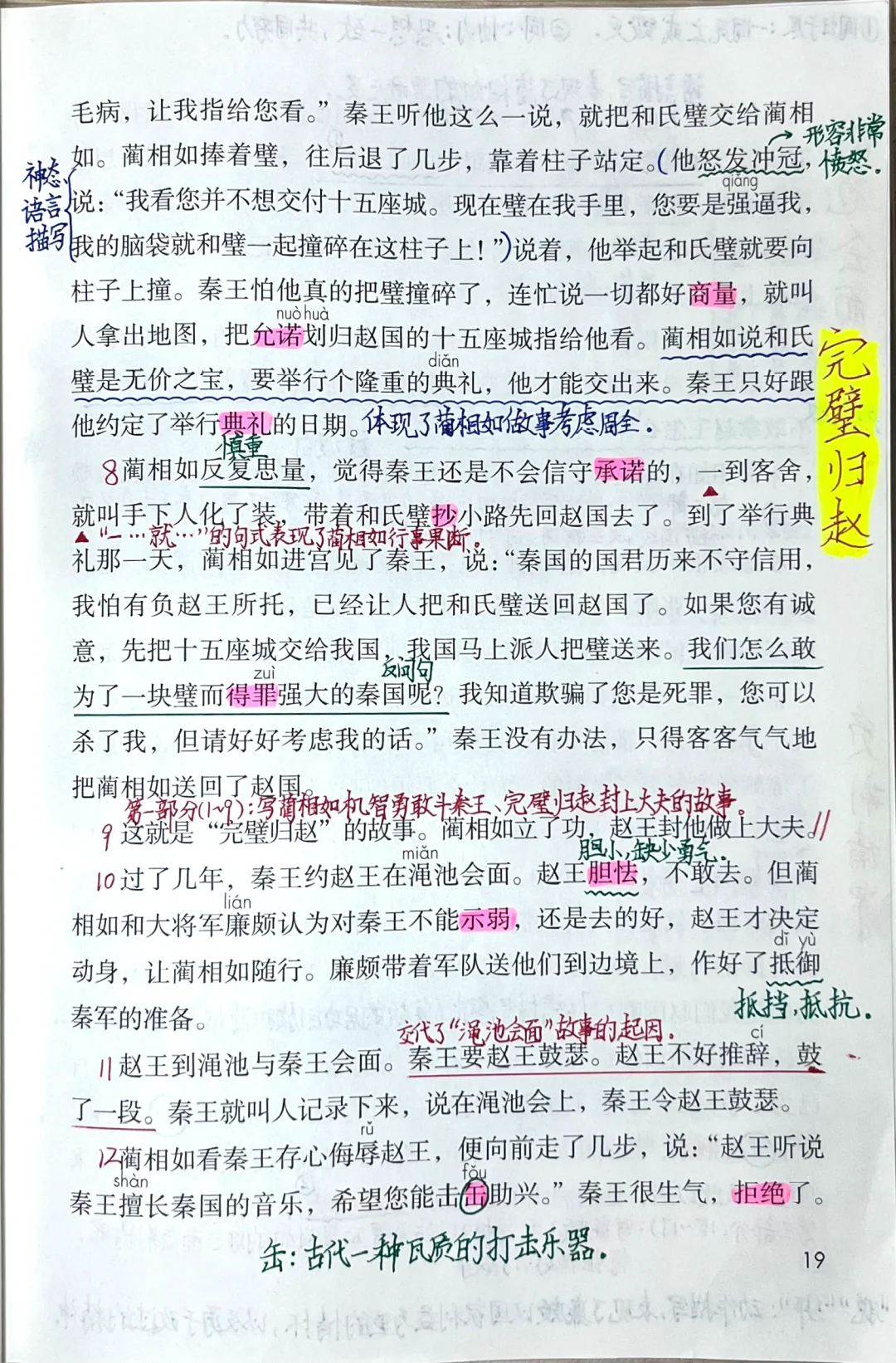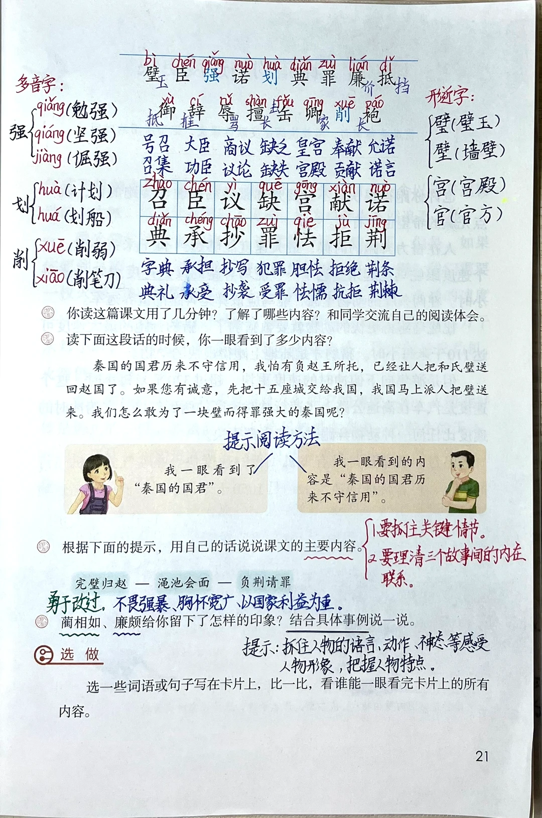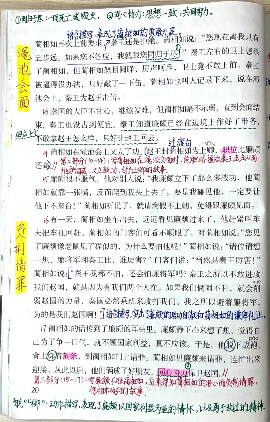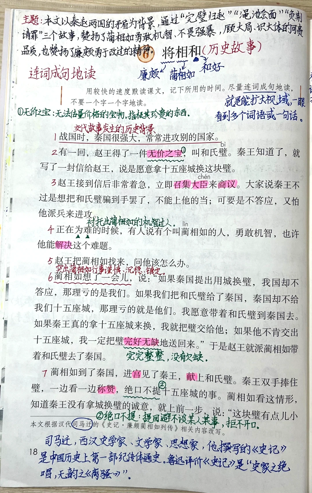 课堂笔记➕课后练习题 快看花花🌹好漂亮[哇R] 这篇课文的笔记做得比较简略噢 【学习目标】 1. 认识“壁、臣”等生字,读准“强、划”等多音字,会写“召、豆”等字,会写“无价之宝、召集”等词语。 2.能尽量连词成句地读课文,提高问读的速度。(重点) 3.把握课文的主要内容,能用自己的话讲述“完壁归赵”“渑池会面”“负荆请罪”个故事。(难点) 4. 能结合具体事例说出对廉颇、蔺相如的印象。(难点) 【背景资料】 本文所写的故事发生在战国时期。当时,比较强的诸侯国有七个,即秦、楚、齐赵、燕、魏、韩,史称 “战国七雄”。其中,秦国国力最强。“完壁归赵”的故事发生在秦国全力进攻魏国的时候。秦国不能集中更多兵力对付赵国,于是企图用威胁的手段占赵国的便宜。