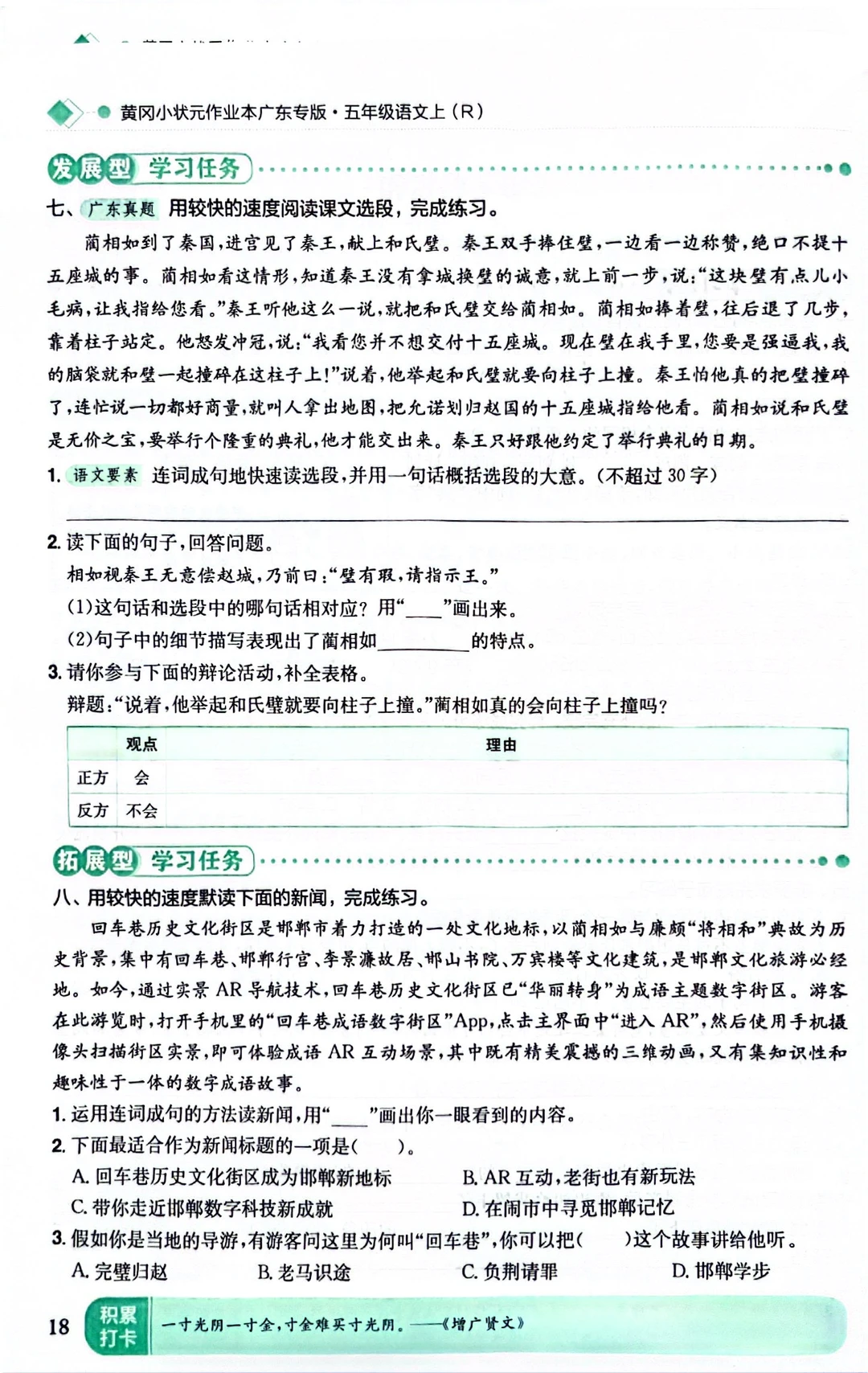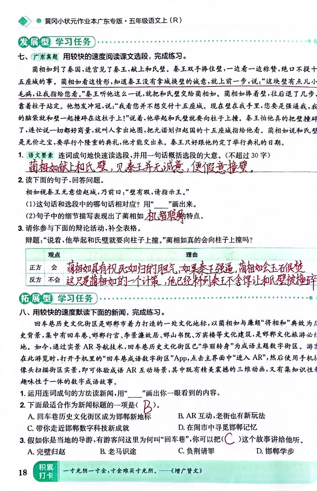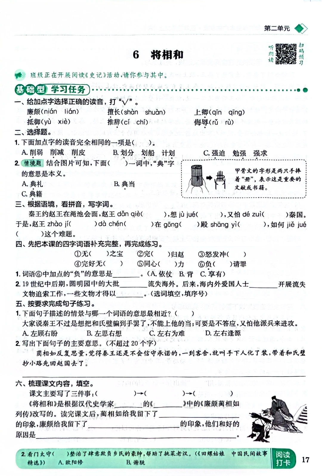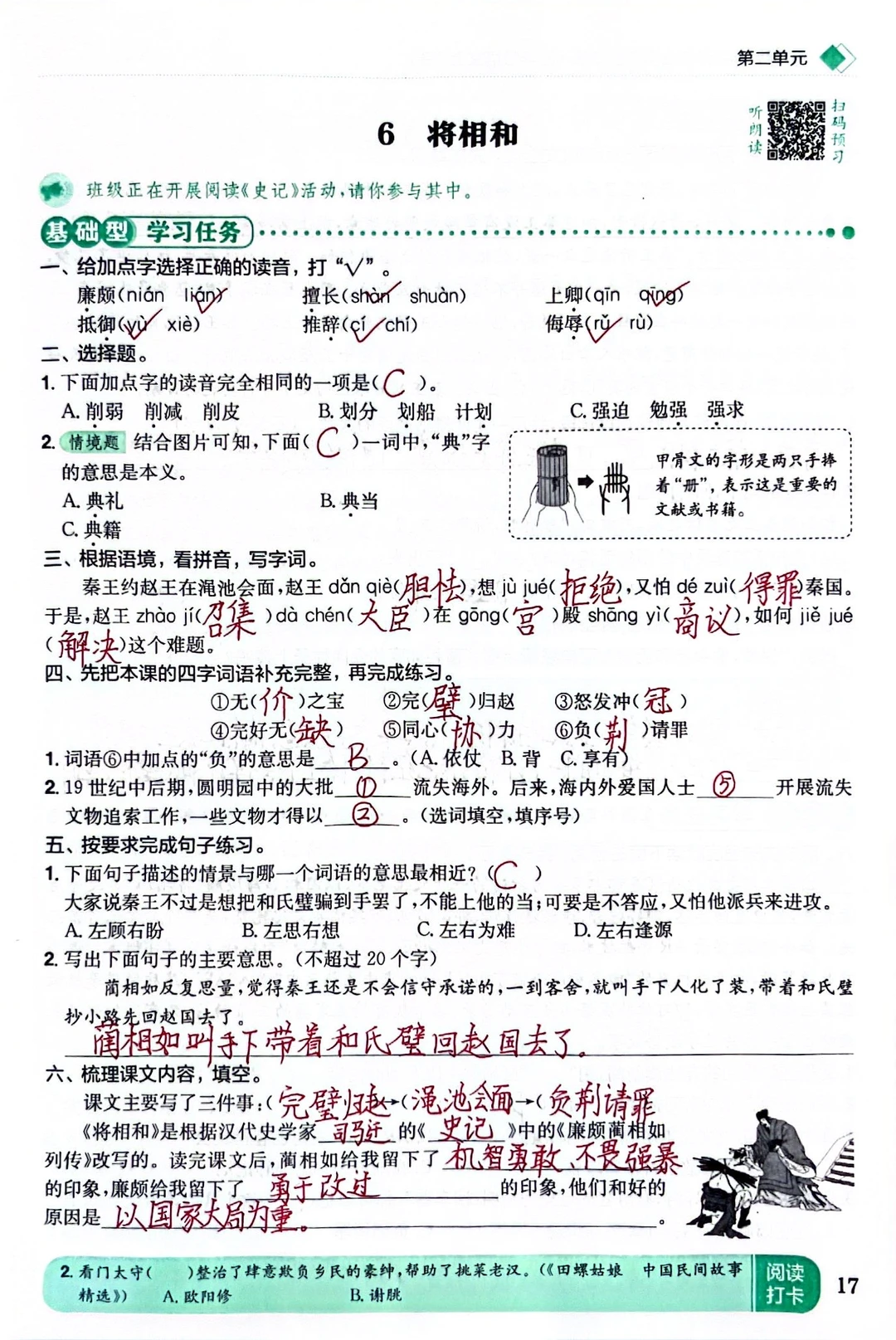 课堂笔记➕课后练习题 快看花花🌹好漂亮[哇R] 这篇课文的笔记做得比较简略噢 【学习目标】 1. 认识“壁、臣”等生字,读准“强、划”等多音字,会写“召、豆”等字,会写“无价之宝、召集”等词语。 2.能尽量连词成句地读课文,提高问读的速度。(重点) 3.把握课文的主要内容,能用自己的话讲述“完壁归赵”“渑池会面”“负荆请罪”个故事。(难点) 4. 能结合具体事例说出对廉颇、蔺相如的印象。(难点) 【背景资料】 本文所写的故事发生在战国时期。当时,比较强的诸侯国有七个,即秦、楚、齐赵、燕、魏、韩,史称 “战国七雄”。其中,秦国国力最强。“完壁归赵”的故事发生在秦国全力进攻魏国的时候。秦国不能集中更多兵力对付赵国,于是企图用威胁的手段占赵国的便宜。