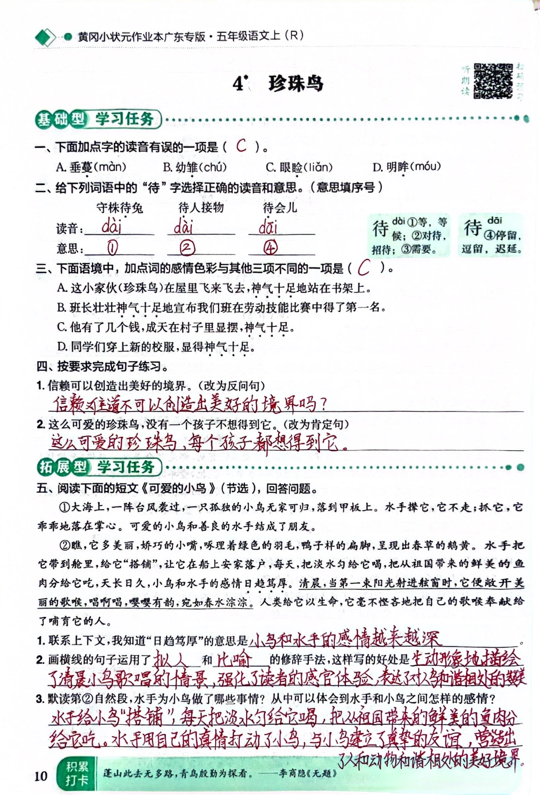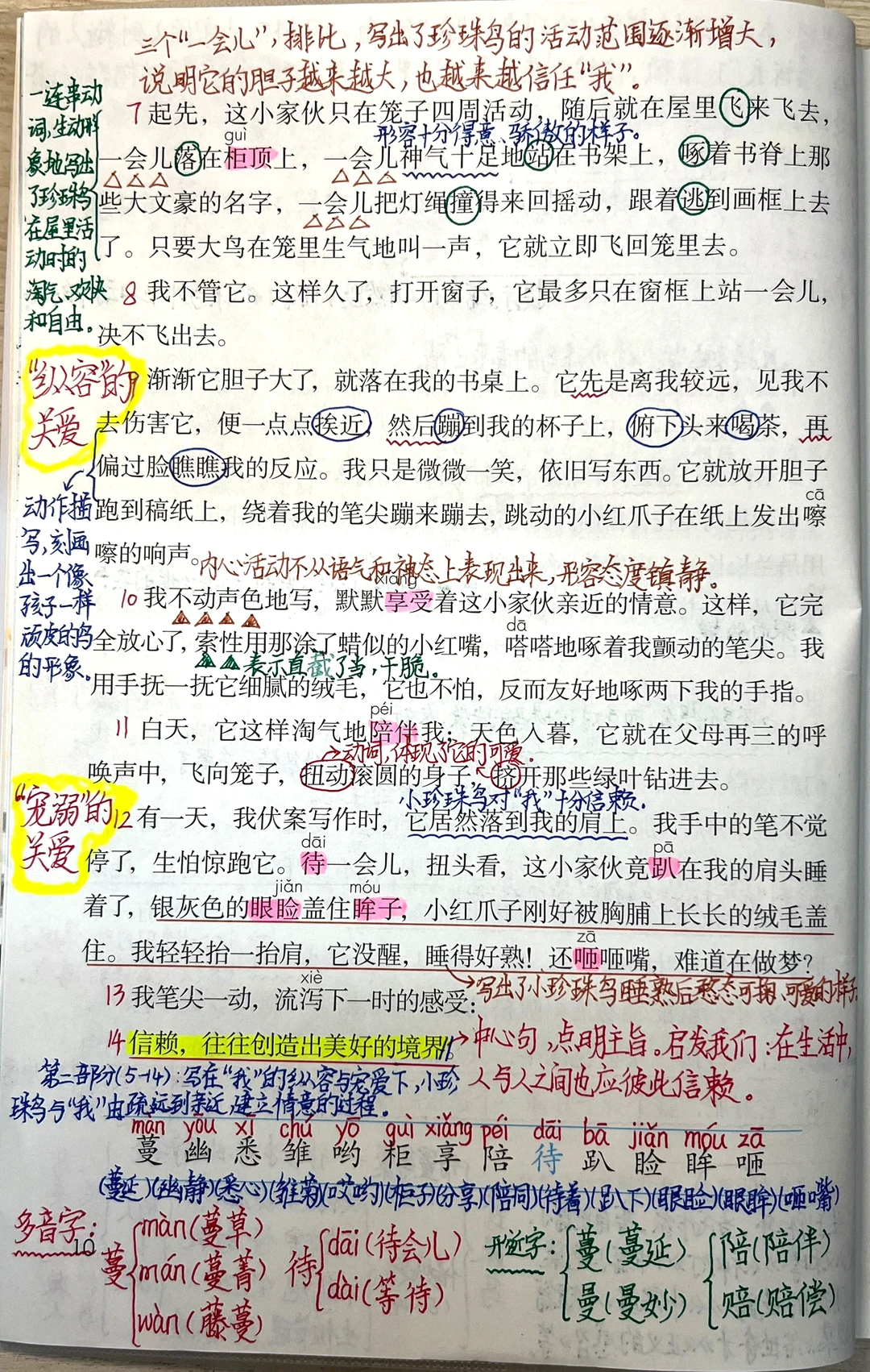 课堂笔记➕课后练习题 【学习目标】 1. 认识“蔓、幽”等生字,读准多音字“待”。 2. 能借助关键语句,体会作者和珍珠鸟之间的情意。(重点) 3. 能梳理珍珠鸟与作者之问情感变化的线索。(难点) 【小小百科】 珍珠鸟。也叫胁草雀、锦花鸟、小珍珠等,容易饲养和繁殖,是一种很有趣的观赏鸟。因羽毛上有许多白色小斑点,形似珍珠,所以叫珍珠鸟。