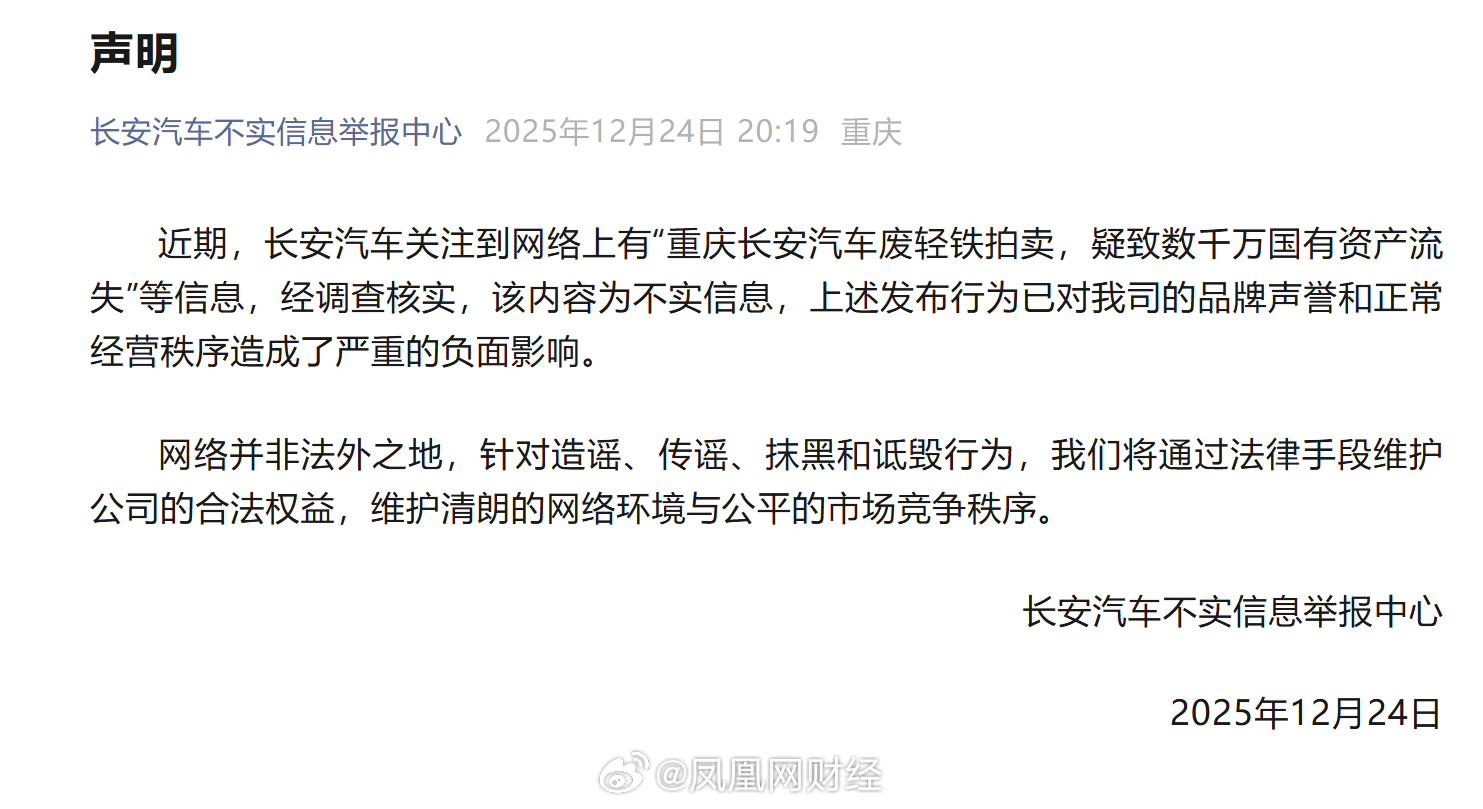 【长安汽车发布声明】长安汽车不实信息举报中心今日发布声明称,近期,长安汽车关注到网络上有“重庆长安汽车废轻铁拍卖,疑致数千万国有资产流失”等信息,经调查核实,该内容为不实信息,上述发布行为已对公司的品牌声誉和正常经营秩序造成了严重的负面影响。针对造谣、传谣、抹黑和诋毁行为,长安汽车将通过法律手段维护公司的合法权益。