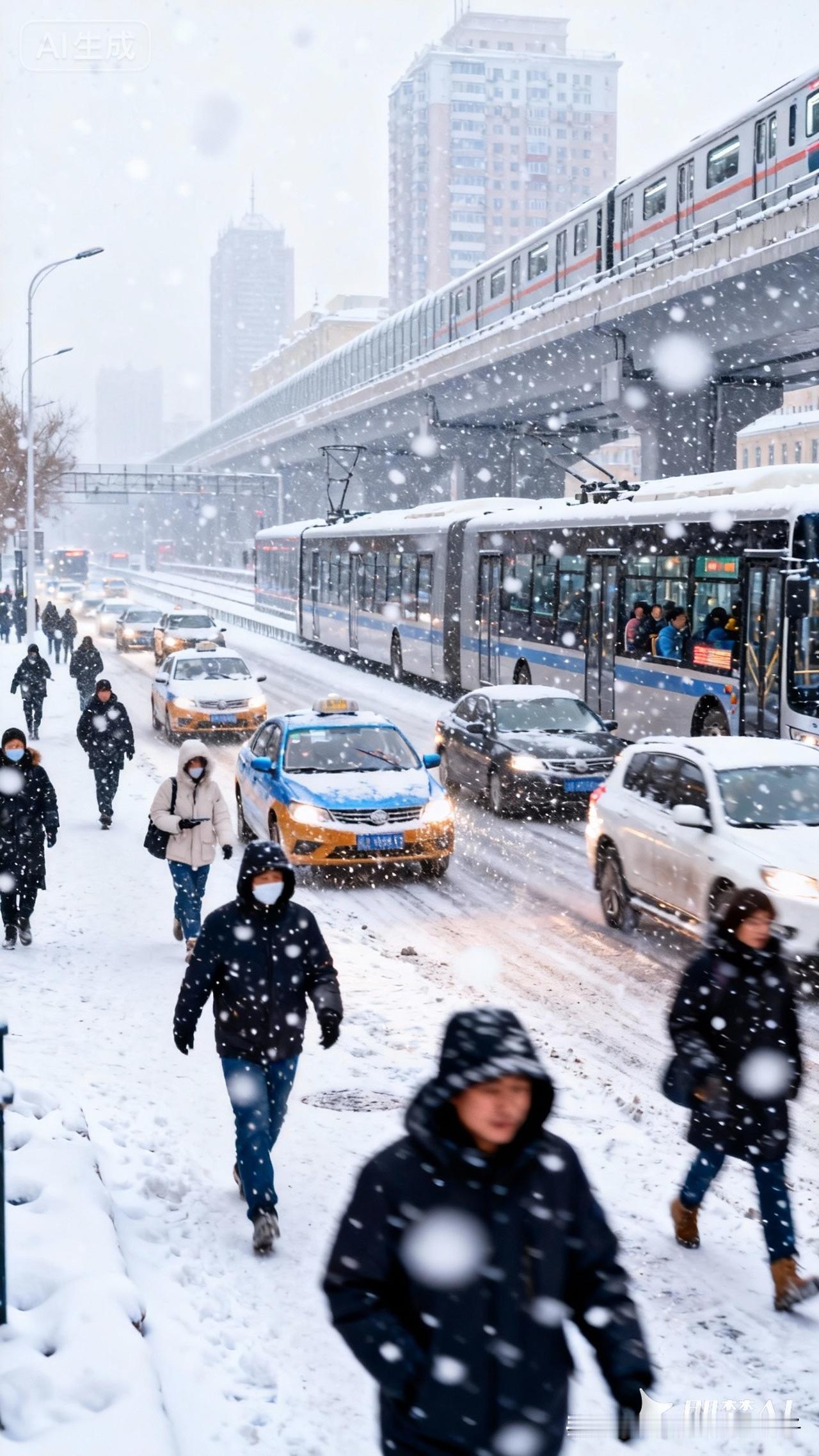 冬日雪景中的城市生活,行人匆匆,车辆穿行,雪花飘落,一片繁忙景象。