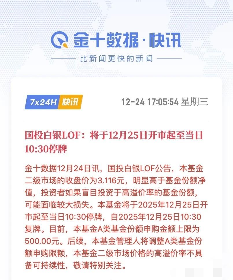 让你冷静呢❗️ 国投白银LOF将于12月25日开始停牌。一般9.30开盘,白银场内10.30开盘,炒白银的人还能多睡一小时,真幸福。