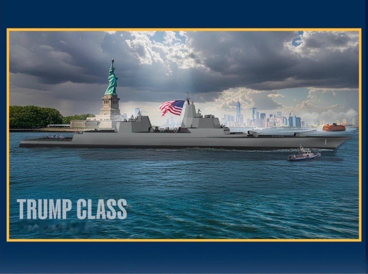特朗普宣布将建造“特朗普”级战列舰,并公布了效果图!据报道,其满载排水量3.5万吨,舰长268米,舷宽32米,吃水9.14米,配置AN/SPY-6相控阵雷达,128单元MK-41垂发,12枚常规快速打击远程高超导弹,还有2门127毫米口径舰炮,动力是柴燃联合动力。有意思的是,特朗普级战列舰的开工时间在2030年。这个PPT得花不少钱,至于能不能造无所谓,什么时候能造好不可知,反正懂王又赢了。看外形,老美想山寨055大驱,但注定是东施效颦。烽火问鼎计划特朗普宣布打造黄金舰队