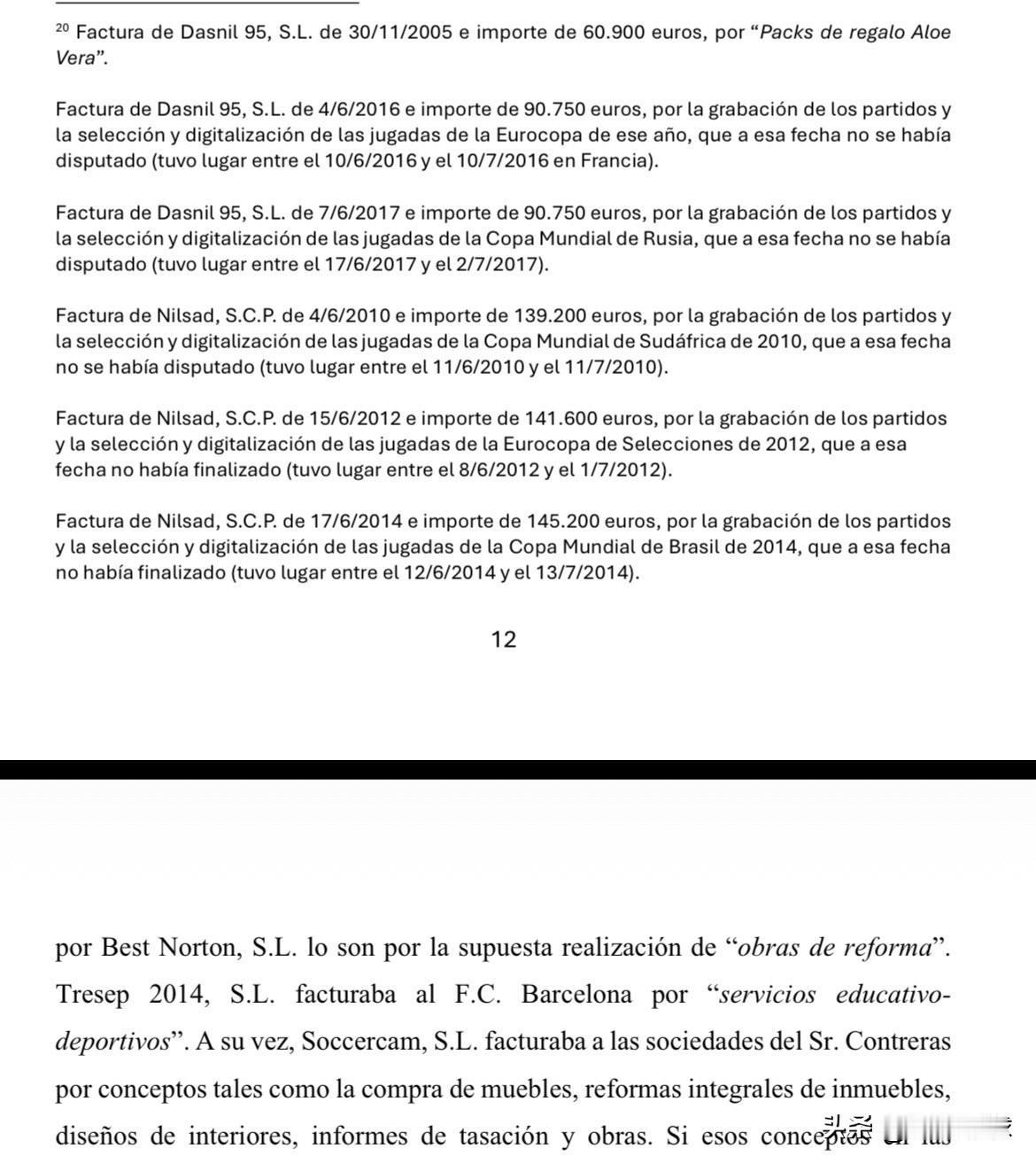 巴塞罗那向裁判委员会副主席内格雷拉支付的部分款项发票细节曝光: - 2005年支付60,900欧元购买"芦荟礼品套装" - 2016年6月4日支付90,750欧元,用于"录制2016年欧洲杯比赛并筛选数字化比赛片段"(注:该赛事当时尚未举行) - 2018年6月7日支付90,750欧元,用于"录制2018年世界杯比赛并筛选数字化比赛片段"(注:该赛事当时尚未举行) - 2010年6月4日支付139,200欧元,用于"录制2010年世界杯比赛并筛选数字化比赛片段"(注:该赛事当时尚未举行) - 2018年6月15日支付141,600欧元,用于"录制2012年欧洲杯比赛并筛选数字化比赛片段"(注:该赛事已于当年6月初开赛,7月才结束) - 2014年6月17日支付145,200欧元,用于"录制2014年世界杯比赛并筛选数字化比赛片段"(注:该赛事已于当年6月12日开赛,7月13日结束) - 巴塞罗那还通过注册在内格雷拉儿子名下的另一家公司向其支付款项,用途标注为"教育目的" - 另通过前巴萨高管何塞普·孔特雷拉斯注册的公司支付款项,用途标注为"装修工程" 消息来源:西班牙检察官办公室法庭文件。📸 @Ramon_AlvarezMM