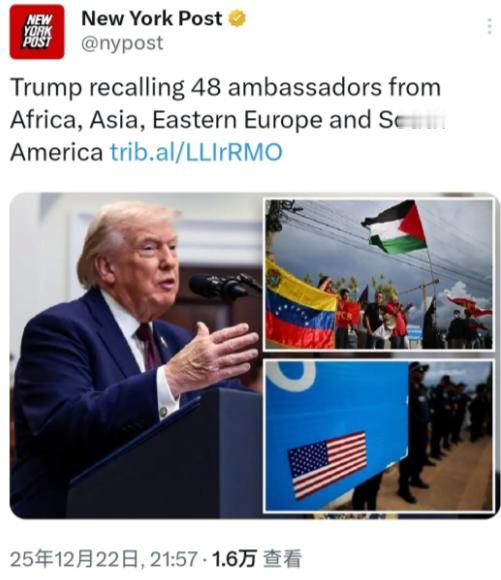 曾经讽刺非洲为“粪坑”的特朗普,现在还是看不上非洲,不想美国浪费钱在非洲大陆上,竟然直接召回25国驻非洲大使。 12月22日,《纽约邮报》报道:特朗普召回48国大使,此次召回的48国大使,非洲占了25个,另外,来自亚洲有11个国家,这些国家几乎都是亚洲最贫穷的国家,剩下的则是其它地区的穷国或者小国。 特朗普这波操作,把“美国优先”四个字演绎得淋漓尽致,说白了就是嫌穷爱富,觉得非洲和那些穷国没油水可榨,不值得美国花心思花钱维系外交关系。所谓的召回大使,本质上就是一场外交层面的“断舍离”,断的是和穷国的联系,舍的是没收益的外交投入,离的是不符合他功利主义逻辑的国际义务。 其实这波操作一点都不意外,特朗普对穷国的嫌弃从来都摆在明面上,这次召回大使只是把之前的理念落到了实处。早在2025年4月,他就下令关闭了专门给非洲和其他发展中国家搞基础设施投资的美国千禧年挑战公司,让不少正在建设的公路、电网项目直接搁置。 也是在同一个月,他推出的所谓“对等关税”清单里,把180多个国家都列了进去,其中就包括一大堆联合国认定的最不发达国家,非洲的马达加斯加被征47%的关税,莱索托更是被征了50%的最高关税,要知道莱索托2024年的GDP总共才20亿美元,连给美国塞牙缝都不够。 美国国务院还嘴硬说召回大使是“任何一届政府的标准程序”,辩称大使是总统的私人代表,有权安排能推进“美国优先”议程的人。 可明眼人都看得出来,这就是针对性的清理,这次被召回的大使大多是拜登时期任命的职业外交官,之前特朗普上任初期已经清理过一波政治任命官员,这次连职业外交官都不放过,就是想彻底把外交系统换成自己人,确保每一分外交投入都能精准指向美国的利益。 现在美国还有大概80个大使职位空缺,特朗普不赶紧补位,反而忙着撤换正在履职的资深大使,说白了就是觉得这些穷国的大使职位可有可无,空着也不影响美国捞好处。 特朗普一直鼓吹要把美国对非政策从“援助转为贸易”,听起来好像挺高大上,实则还是想从非洲捞实在好处。2025年7月他和五个非洲国家领导人会晤时就明说了,非洲矿产和石油储量丰富,美国要扩大获取关键矿产的渠道。 言外之意很清楚,援助是花钱的,贸易才能赚钱,要是非洲不能给美国提供这些资源,那美国连表面功夫都懒得做。这次召回25个非洲国家的大使,就是用实际行动告诉非洲:没好处可拿,美国就不陪你们玩了。 不只是非洲,亚洲的穷国也没逃过他的“嫌弃”。这次被召回大使的11个亚洲国家,几乎都是最贫穷的那种。这些国家经济结构单一,很多都靠出口农产品或初级产品过日子,本来就指着美国市场活,结果特朗普一边召回大使,一边加征高额关税,柬埔寨被征49%,老挝48%,缅甸44%,把这些国家往绝路上逼。 有专家都忍不住骂,这种关税政策就是邪恶的,把美国的强大建立在压榨最脆弱的经济体之上,可特朗普根本不管这些,他眼里只有美国能不能赚钱。 这背后其实是美国外交逻辑的彻底变质,以前美国还会装装样子,搞点援助、讲点道义,维持一下“世界警察”的形象。可特朗普来了之后,连伪装都懒得弄了,直接把外交变成了生意,每一笔投入都要算回报率。 在他眼里,国家没有大小强弱之分,只有能带来收益和不能带来收益的区别。那些能给美国提供资源、市场的国家,美国就笑脸相迎;那些需要美国援助、没法给美国带来直接好处的穷国,就被当成包袱一脚踢开。 这种功利主义的外交政策,短期看好像能帮美国省点钱,可长期来看,却是在砸自己的脚。美国全球外交服务协会的人都坦言,这种做法会削弱人们对美国职业外交官的信心,让美国的外交地位受损。现在特朗普把80个大使职位空着,还在忙着撤换驻穷国的大使,相当于把这些地区的外交话语权拱手让给了其他大国。 这种嫌穷爱富的做法,彻底暴露了美国的霸权本质,让更多国家看清,美国所谓的盟友、伙伴,不过是基于利益的相互利用。 说到底,特朗普召回25国驻非大使,就是一场赤裸裸的利益筛选。他用最直接的方式告诉全世界,美国的钱不会花在无足轻重的国家身上,只会花在能给美国带来收益的地方。这种做法看似精明,实则短视,把外交的道义和长远价值抛诸脑后。 曾经的美国还会用援助和外交维系全球影响力,现在却只剩下赤裸裸的利益算计,这样的美国,正在一步步失去曾经的号召力。 而那些被特朗普抛弃的穷国,也会慢慢看清谁才是真正值得信赖的伙伴,美国的这波操作,最终只会让自己越来越孤立。