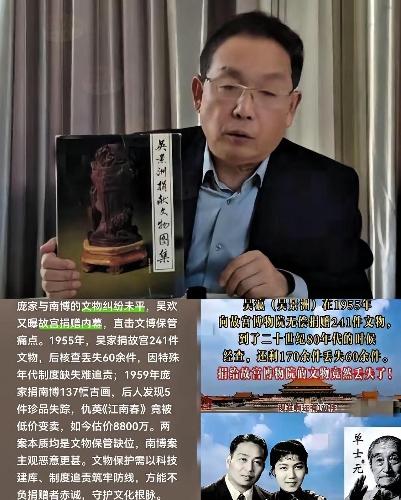 南博的事还没平息,又一个重磅消息砸了过来。 就在国家文物局开始调查南博的时候,近代故宫博物院创建人之一吴瀛的孙子,戏剧家吴祖光之子吴欢,爆料祖父捐给故宫的241件珍品,几十年后只剩170余件,60多件凭空消失,回应只甩“制度不健全”的空话,连追索方案都拿不出来。 吴瀛不是什么附庸风雅的闲人,他是实打实的故宫奠基人之一,当年溥仪被赶出紫禁城,正是他和李煜瀛、易培基等人连夜奔走,才阻止了宫内文物被变卖、损毁的厄运,这份护宝功绩,随便翻一本故宫史都能找到。他捐给故宫的241件文物,不是家里堆着没用的闲置物件,是他耗费半生积蓄、踏遍大江南北淘来的宝贝,里面有唐宋的绢本书画、明清的官窑瓷器,还有不少罕见的金石拓片,每一件都贴着他的体温,每一件都藏着他对中华文化的敬畏。他当初主动把这些藏品交出去,没要一分钱补偿,甚至没提过留名的要求,就认准了一个理——这些东西是民族的遗产,放在故宫里能被好好保管,能让后世子孙都瞧见老祖宗的智慧,这才是它们最好的归宿。60多件文物凭空消失,这不是一串冷冰冰的数字,是60多个文化符号的断裂,是60多段历史记忆的遗失,随便拎出一件,都可能是研究某个朝代艺术的关键佐证,丢了就是不可逆的损失。一句“制度不健全”就想把这事糊弄过去,也太不负责任了,制度不健全可以慢慢完善,可文物是独一无二的,没了就是真的没了,拿“制度”当挡箭牌,根本是在逃避责任。那些负责保管文物的人,入库的时候有登记、出库的时候有审批、盘点的时候有核对,这些流程不是摆给外人看的花架子,是守护文物的最后一道防线,防线松了,文物自然会不翼而飞。吴欢站出来爆料,不是为了蹭热度博眼球,是为了给九泉之下的祖父一个交代,是为了让那些消失的文物有个明确的去向,换作任何一个后人,看着先辈的心血不明不白没了,都不可能忍得下这口气。当年像吴瀛这样的爱国人士太多了,他们有的捐钱,有的捐物,有的甚至为了护宝搭上了性命,他们图的不是名不是利,是怕咱们的文化根脉断在自己手里。当时护宝人的心酸与执着,从吴瀛留下的日记里就能深切感受到,他曾写下“文物存,则民族精神存”,现在文物在自家库房里流失,就是在剜民族的魂。文物保护从来不是一句喊喊而已的口号,得有实打实的行动,得有能落地的追索方案,得有对捐赠者、对历史负责的态度。要是连故宫这样的顶级文博机构,都守不住捐赠的文物,那怎么对得起那些倾囊相赠的先辈,怎么对得起眼巴巴等着看文物的子孙后代。各位读者你们怎么看?欢迎在评论区讨论。