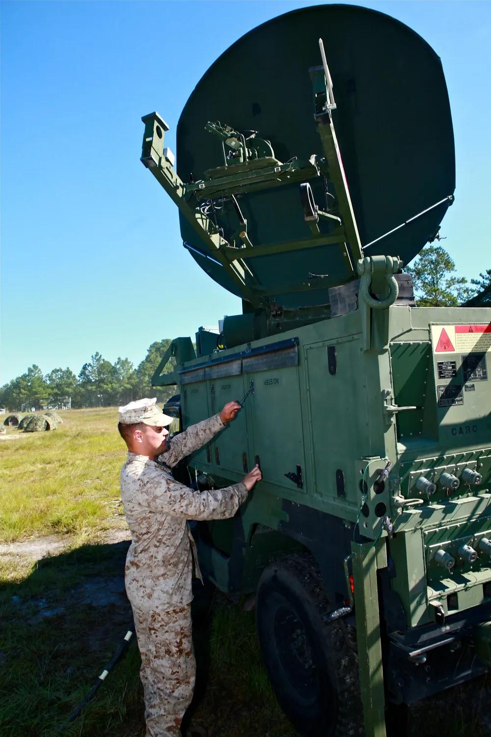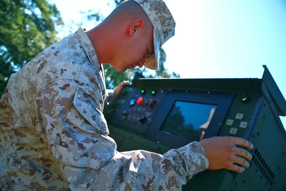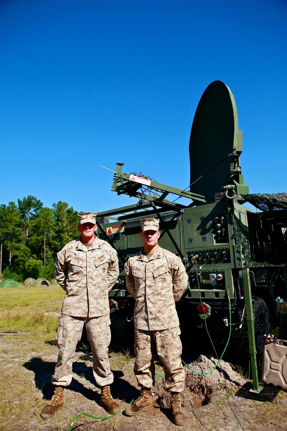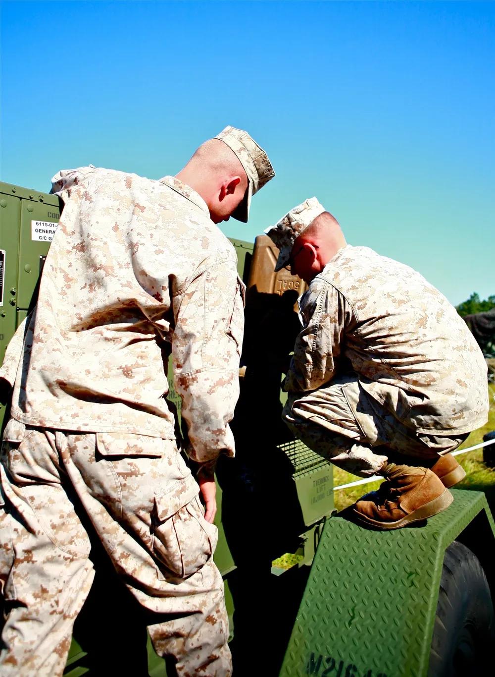 有了马斯克的“星盾计划”,美军在通信领域“如虎添翼”。 9月25日,隶属于美军第二海军远征军司令部集团第8通信营阿尔法连的菲利普·J·登斯塔德下士(左),一名卫星技术员,以及托马斯·亚当斯下士(右),一名卫星通信操作员兼维修专家,两人于在海军陆战队勒琼营第8通信营的野外演习中站在ANTCS-156C凤凰城终端前。凤凰终端从卫星提取数据,为现场和部署的海军陆战队员提供互联网、电话和数据能力。