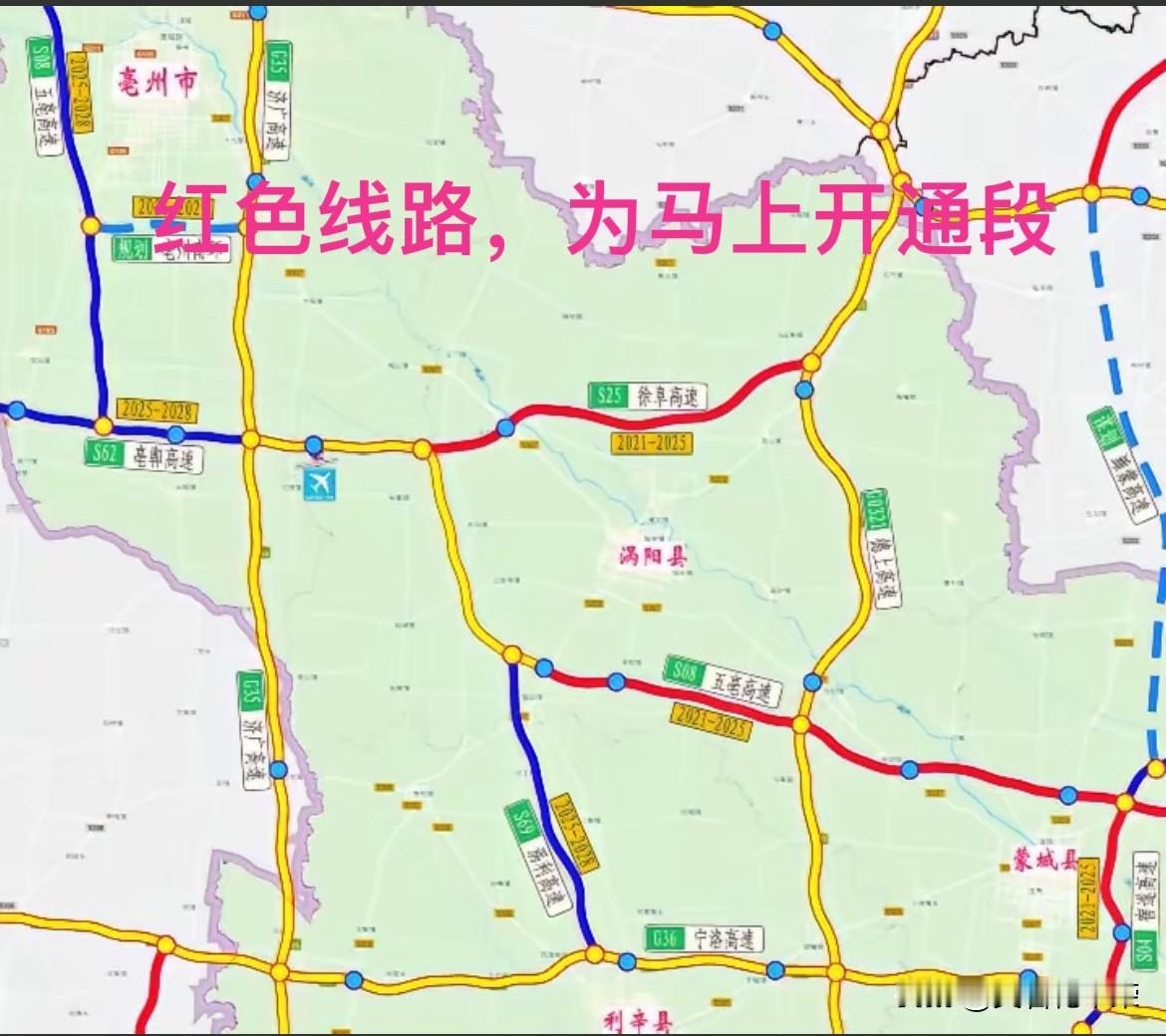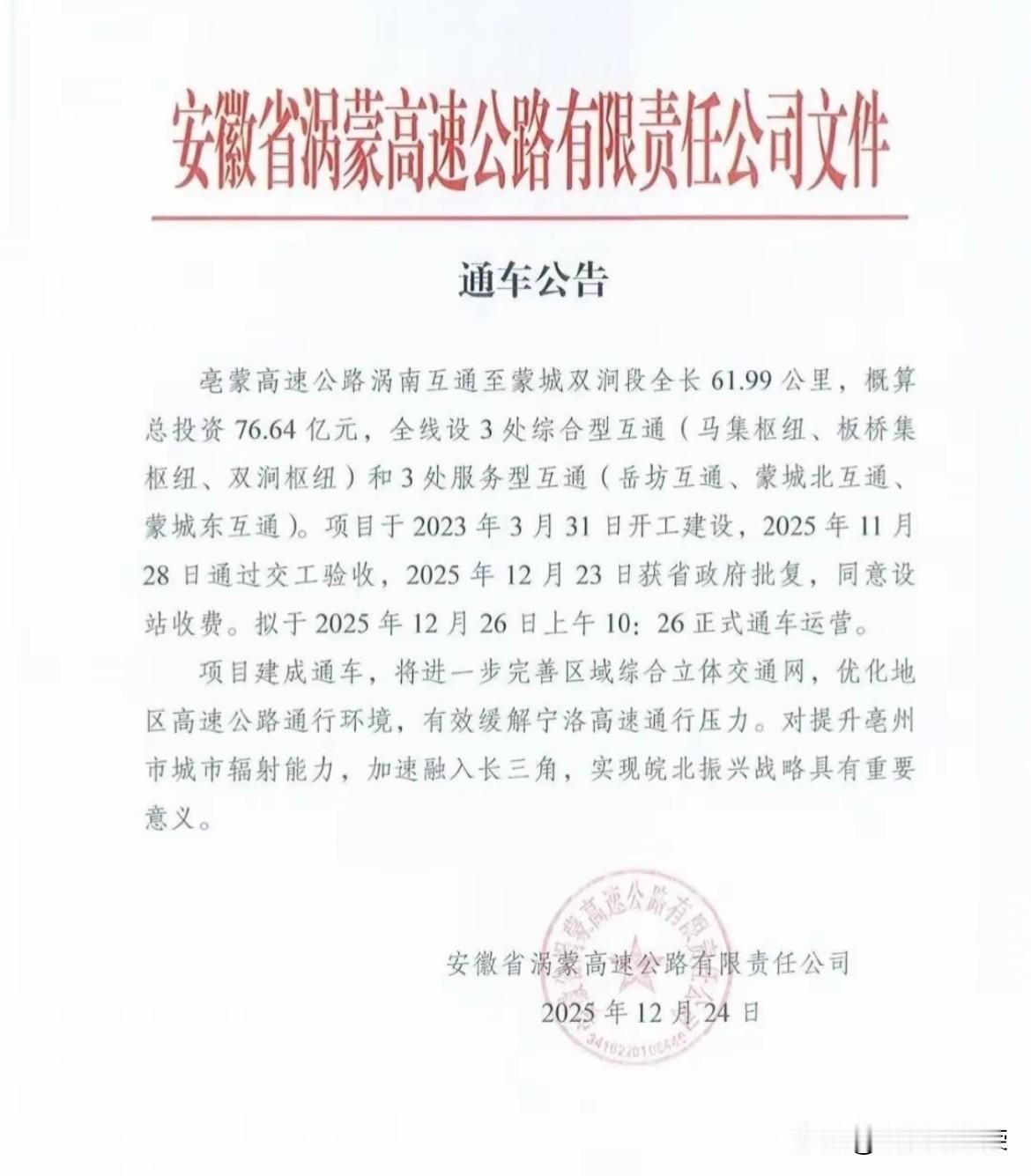 2025年12月26日,安徽高速大事件。 1、徐淮阜高速涡阳段通车,也是全线通车 2、五亳高速蒙城到亳州段将通车运营,也是全线通车。 这两条高速都是在皖北腹地,对皖北的发展有重要意义。 皖北,亳州,阜阳,蚌埠,淮北这几个城市的很多县城将更加连接紧密,出行更加方便。 安徽高速再上新台阶。 皖北高速建设 徐淮阜高速 皖北高速建设 涡阳高速地图