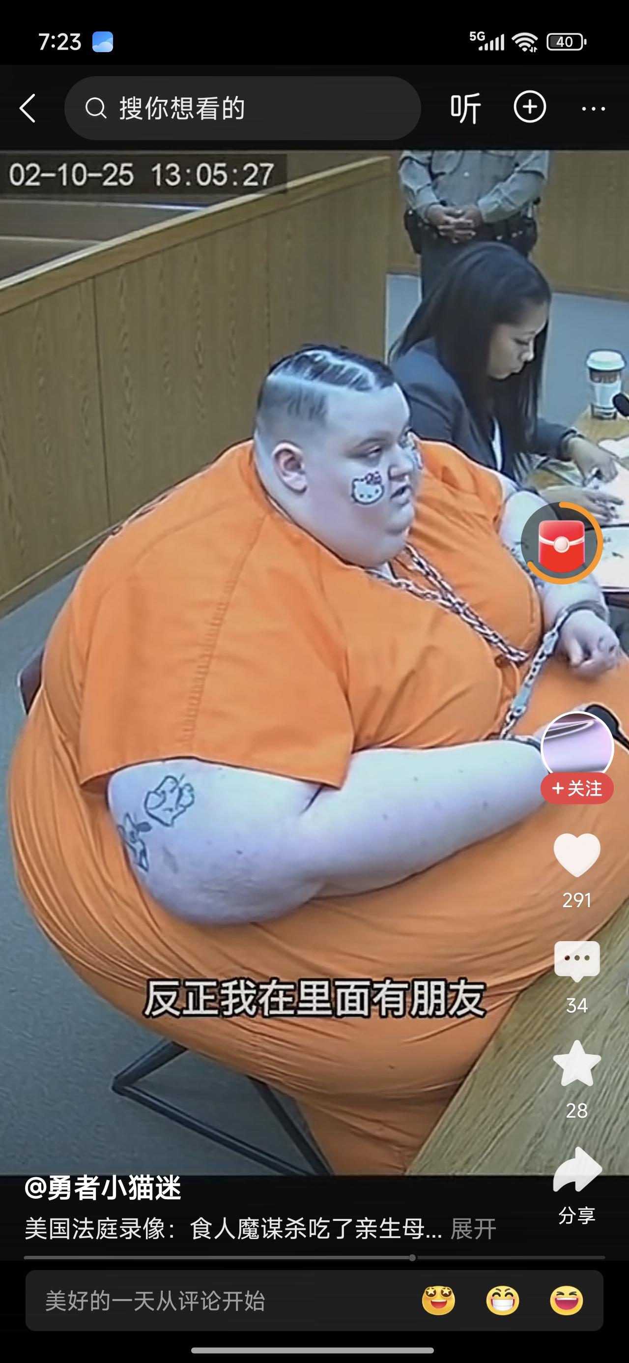 这么胖,没啥吃的把妈妈吃了!法官判他进去,不得假释。他说无所谓,反正他有朋友在里面。 关键问题是,里面能吃饱吗?也许减肥成功了呢?说不定几天就饿死了。 他在外面吃的挺多啊,能胖成这样,小头型也挺利落,衣服也干净的。不对,这衣服跟大帅哥打死保险经理的叫什么来着,路易吉一样啊!妈呀,还有这么大号的!