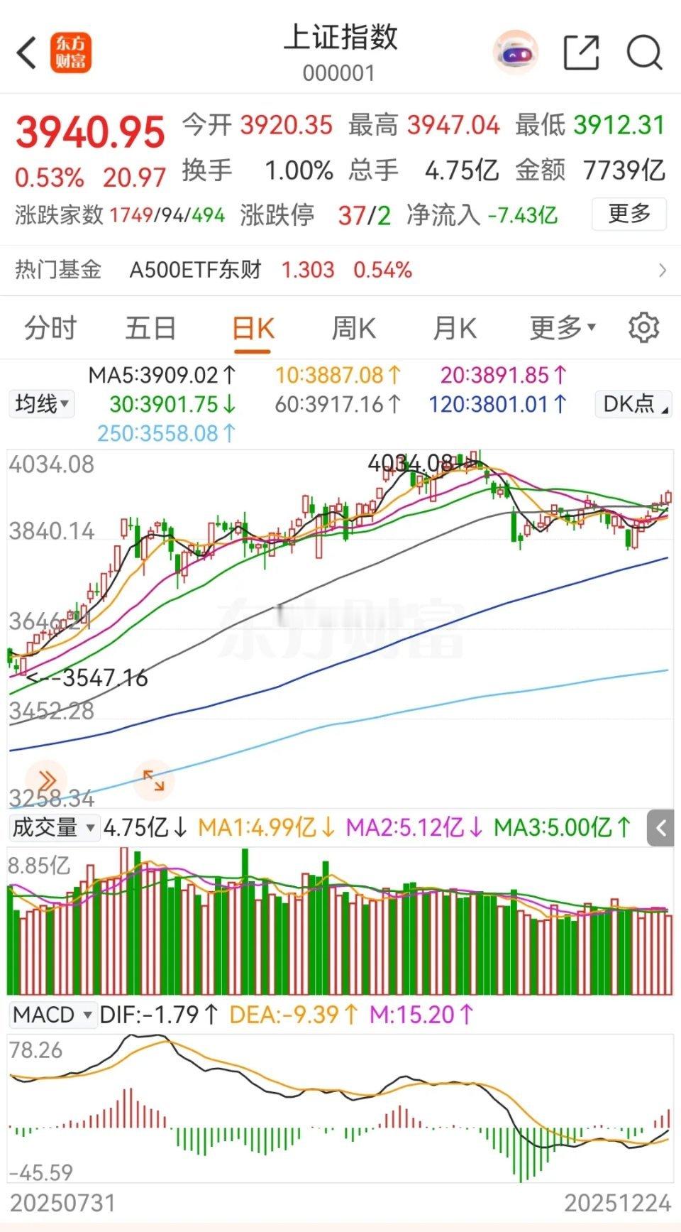 不知不觉大盘已经是六连阳了。今天整体成交缩量,但上午缩量下午放量,后面两天可能还会往上走一走。不过很快也要碰到箱体上沿了,前面低位买进去的,可以考虑回收一些仓位。距离25年结束也没几个交易日了,从年初的3200点,到4月的3040点,再到现在的3900多点乃至4000点,我们毫无疑问正处于牛市之中,但其实大部分散户仍然是亏钱的。高位加仓是牛市亏钱的主要原因。好在目前牛市仍远未结束(可以简单地认为在国内基本面确认复苏之前都是牛市),散户们还可以从容挑选低位板块进行布局,并耐心等待。