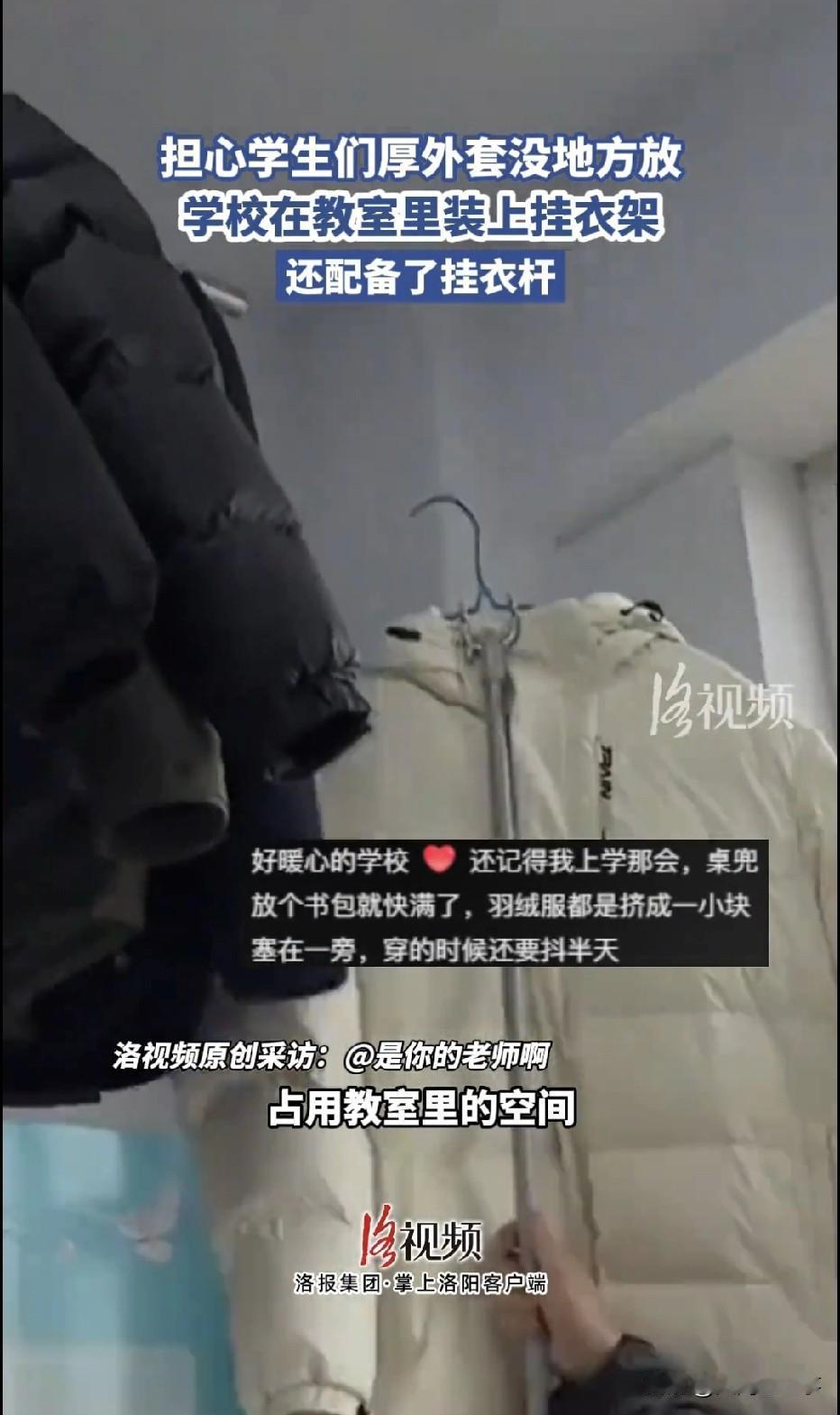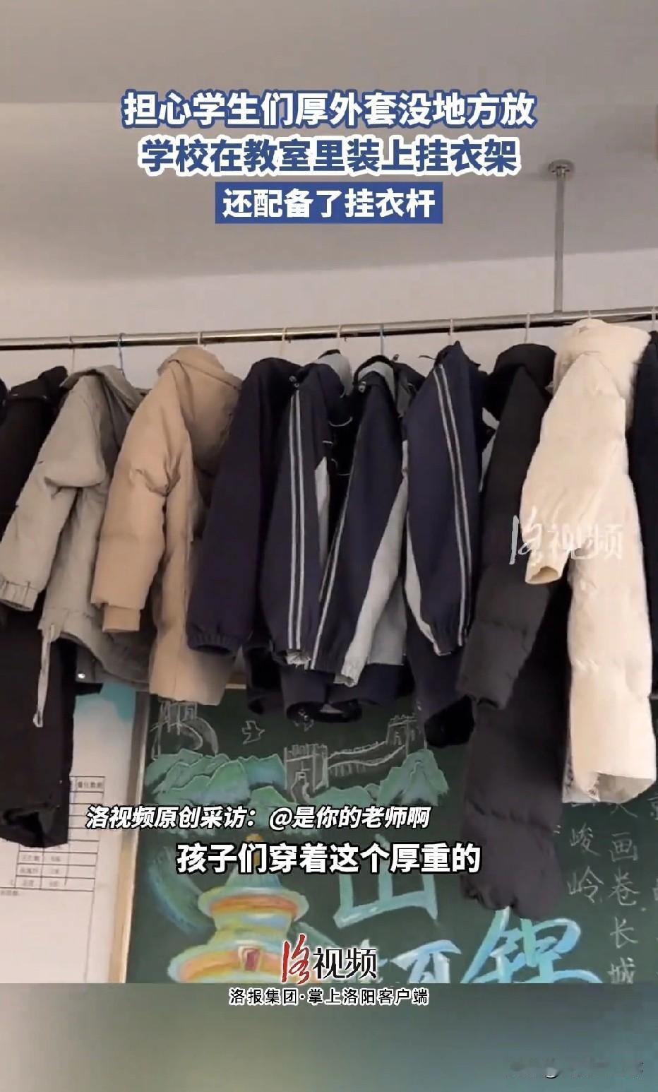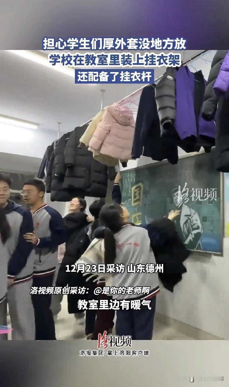 山东德州,气温骤降,一所中学里,老师担心学生们的厚外套没地方放,学校便在教室里装上了挂衣架,还配备了挂衣杆,彻底解决了学生的厚外套找不到地方放的糟心事,这波人性化操作,直接“暖”了学生整个冬天,更是让无数网友羡慕到眼红。 北方的冬天,可谓是冷得刺骨。这几天,山东德州的气温更是骤降,室外寒风呼呼的吹,每个人都冻得缩着脖子,可学校的教室里,暖气却烧得足足的,十分暖和。 这种冰火两重天的尴尬,在学生身上体现得淋漓尽致。学生们每天都要穿着厚重的羽绒服,或者大棉袄去上学,由于室内室外温差大,一进教室,还没过几分钟,学生们就都满头大汗,浑身燥热。 于是,很多学生都会把外套脱了,但教室空间有限,找不到地方放,学生们脱下外套后,要么就是放在手里拎着,椅背上搭着,要么就是往课桌洞里塞,整个教室一眼看去,厚外套堆得满教室都是,不仅乱糟糟一团,占地方,而且还容易把衣服弄脏,看着十分闹心。 前来上课的老师看到这一幕,心里十分不是滋味,学生们上课穿着厚外套,不仅写字不方便,听课也会受影响,再加上课桌本来就不大,如果还要放上厚衣服,那整个课桌都会被挤得满满当当。 这件事,几乎成了入冬后所有老师学生最头疼的难题。但校方对此并没有视而不见,也没有随便敷衍了事。 看到学生们的困扰后,学校第一时间就安排人摸排了全校教室的情况。从校长到后勤老师,所有人心里就只有一个念头,那就是必须给学生们解决好这个难题。 于是,说干就干,效率拉满。无论是采购,还是安装,都是一气呵成。很快,一排排崭新的挂衣架齐刷刷在全校每一间教室亮相。 统一规格的挂衣架,再搭配上结实的挂衣杆,整整齐齐靠墙摆放,一点也不占课堂的核心空间。位置更是选得恰到好处,学生们伸手就能挂衣、取衣,既方便又顺手。 看到这一场画,真的是暖到了心坎里。学生们上课前,纷纷把厚重的羽绒服、棉外套脱下,然后挂到衣架上,原本乱糟糟的教室也瞬间变得十分整洁,课桌旁、椅背上再也没有衣物堆积的乱象。 而且,学生们穿着轻便的内搭上课,坐姿舒展,写字也更利索,脸上满是开心。有学生高兴的说,以前上课时,厚外套十分绊手绊脚,现在终于能安心听课了。 还有学生说,厚外套挂得整整齐齐,一眼看去心情很是舒畅,再也不用担心衣服会被弄脏弄皱了。 这件暖心的事被发到网上后,网友们纷纷表示羡慕不已,更是为校方的做法点赞。 有网友说,这才是真正为学生着想的好学校,细节里藏着满满的温度。也有人感慨,现在的孩子太幸运了,遇上了这么贴心的校方和老师。还有不少网友则喊话本地学校:能不能抄抄作业! 一件看似不起眼的小事,却尽显学校的育人初心。没有华丽的口号,只有实实在在的行动。从学生的切身需求出发,解决冬日里的小烦恼,这份人性化关怀,远比说教来得动人。 截至目前,德州这所中学的每间教室,都已经配齐挂衣架与挂衣杆。学生们彻底告别厚外套堆放的困扰,冬日课堂变得清爽又舒适。 校方的暖心举措,不仅收获了全校师生的认可,更在全网收获了无数好评。其实,校园治理的温度,从来都藏在细节里。 一所真正优秀的学校,不仅教给学生知识,而且也懂得呵护学生的日常点滴。小小的挂衣架,撑起的不仅是一件件厚外套,更是学校对学生最真切的关怀。 对于此事,你有什么看法呢?