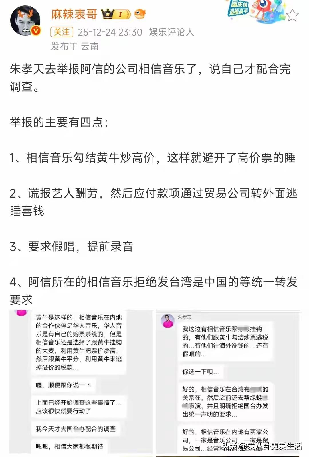 这个消息惊的我目瞪口呆。 朱孝天不会真有这样的勇气吧? 说他举报5月天,内容相当炸裂,具体请看某娱乐博主的内容,图四。 话说5月天风波那么厉害的时候,都扛了过去,没有塌房。 莫非真的会被一个同行儿给终结吗?