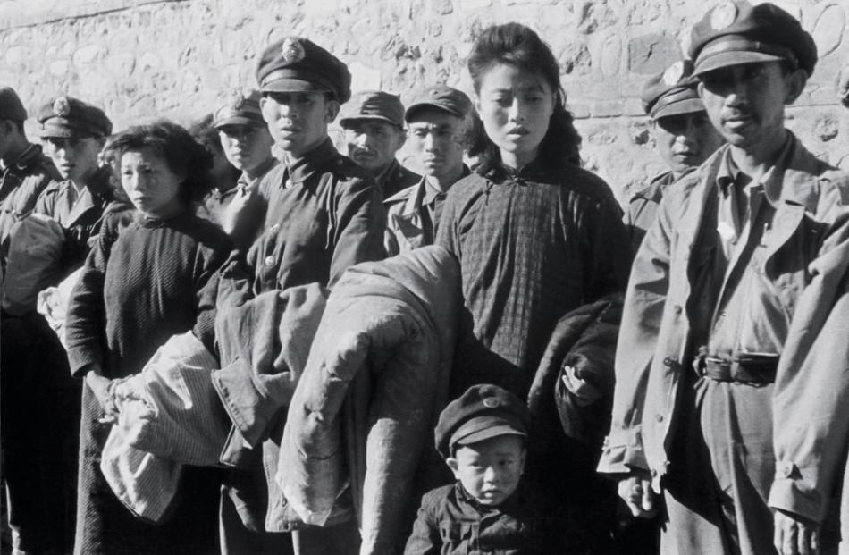 辽沈战役期间,一群国民党军官及其家属(包括妇女和儿童)排成一列,站在石墙前。军官们许多人表情茫然;妇女穿着传统旗袍或棉衣,抱着衣物或孩子,孩子们则紧挨大人,眼神惊恐。这是他们被解放军押解或集中看管的状态。 在辽沈战役中,东北人民解放军(后称第四野战军)以6.9万余人的伤亡代价,歼灭国民党军47.2万余人,其中俘虏32.43万余人,包括少将以上高级军官186名(如廖耀湘、范汉杰、郑庭笈等)。许多国民党军官在城破后携家属投降或被俘,解放军通常给予优待政策:军官家属往往被安置在临时集中点,待甄别后遣返或安置。