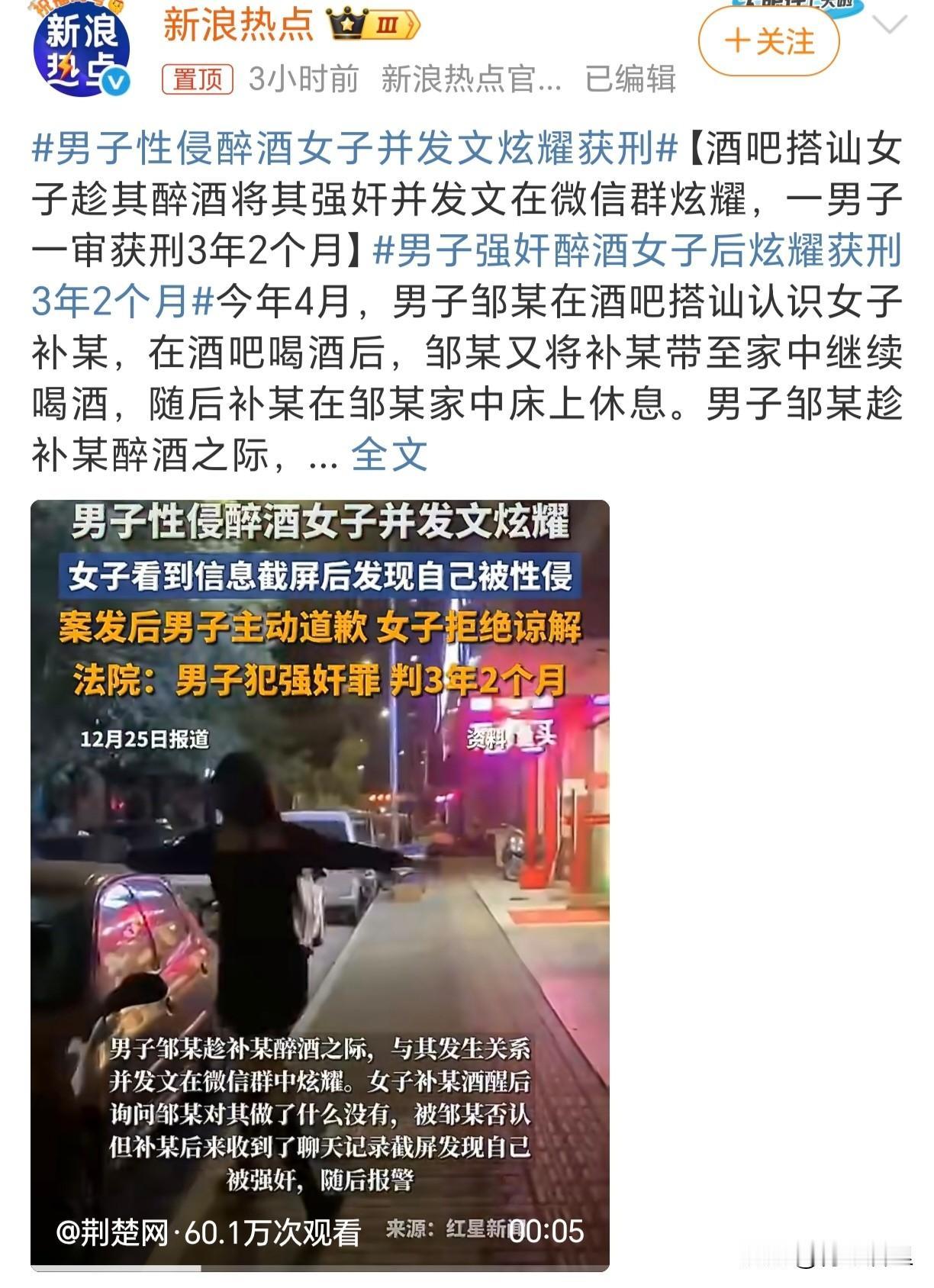 一个女生,在外面喝酒的时候一定要带个靠谱的朋友呀,自己一个人太危险了。 刚看到一个新闻。在长沙的酒吧,男子邹某搭讪认识了女子补某,酒后补某被邹某带回家。在她醉酒无力时,邹某侵犯了她。更无耻的是,事后,邹某还把这事当成“谈资”发到微信群里炫耀。 女孩醒来后隐约不安,追问却被否认。直到那些不堪的聊天记录截图,她才确认自己受到侵犯,立刻报了警。现在判决下来了,邹某因强奸罪被判了三年两个月。 所以,说一千道一万,女生在外面喝酒一定要当心。喝酒放松不是错,错的是那些心怀鬼胎的人。多留个心眼,别让爸妈担心,也别让坏人有机可乘。男子性侵醉酒女子并发文炫耀获刑 社会新闻