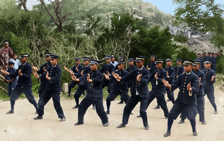 20世纪30年代,国民革命军进行传统武术训练的真实历史影像,拍摄于野外训练场。 一群身着军装、头戴军帽的士兵排成整齐队列,正在集体练习徒手武术套路。动作统一为弓步出拳,姿势标准、精神饱满,训练旨在提升士兵体质、近战能力和士气。 1928年南京国民政府成立后,为“强种救国”,大力推广“国术”。中央国术馆负责整理、推广武术,并向军队、学校普及。1930年代初,许多国民党部队将传统武术纳入日常训练,结合德式操练。