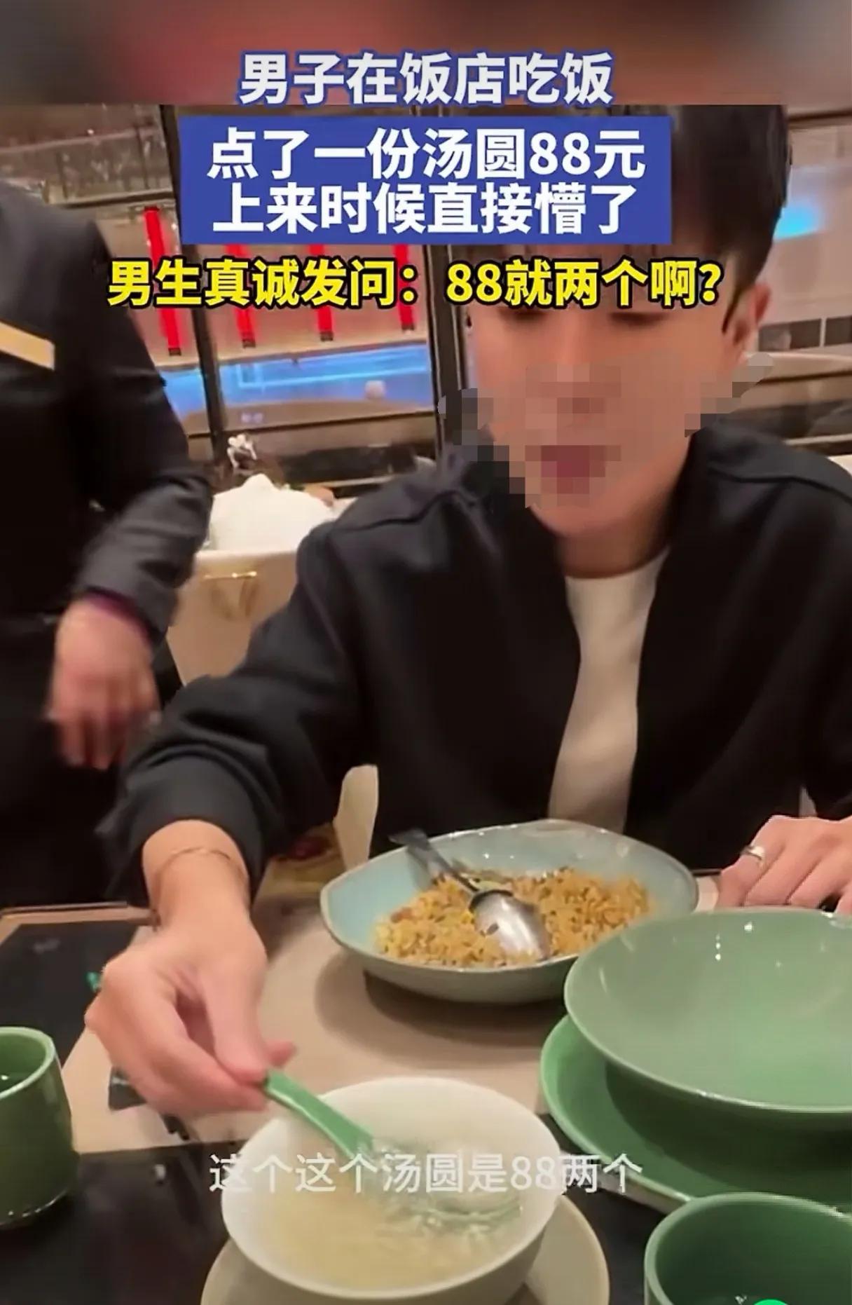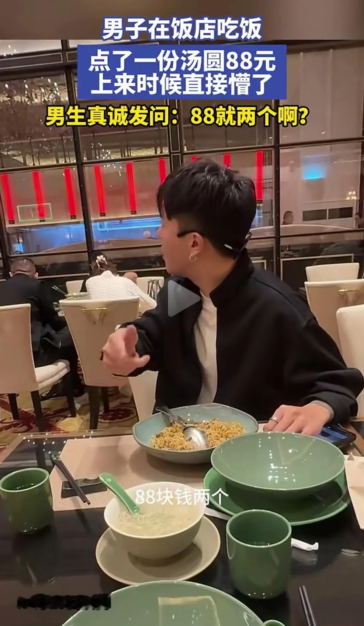 男子澳门点了一份88元汤圆,结果服务员端上来让他怀疑人生,满是惊奇的问服务员,88元两个?值班经理过来服务,明确告诉他这个汤圆就是88元两个! 男子最后无奈的笑了,估计也意识到自己见少识少了,人家卖这价不知多少年了,这是高端消费场所,明码标价。 以前有个相声段子,说在酒吧点了一杯心动的感觉,要5000块,光想着心动了,结果服务员端上来心真的动了,一杯白开水![笑哭][笑哭]