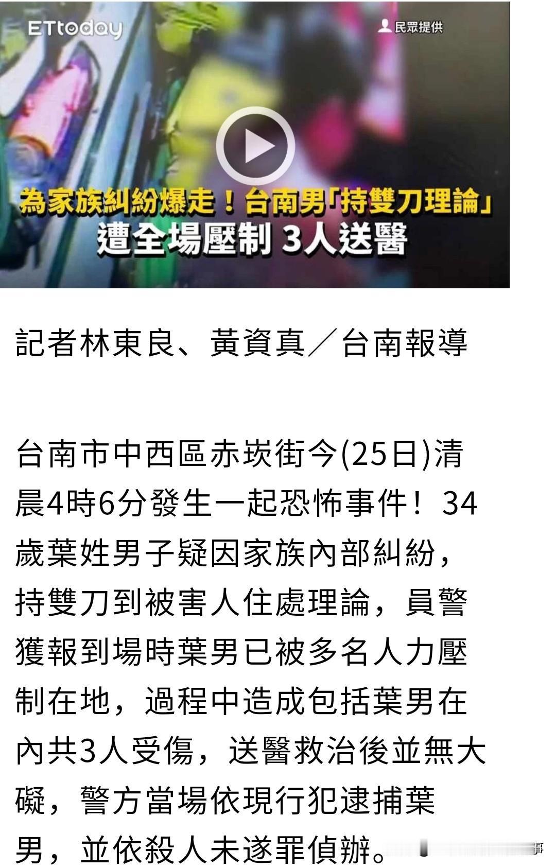 不可思议,今天短短不到半天,台湾省发生三起砍人案! 犯罪心理学一直强调重大社会刑事案件,不能大规模报道,因为会刺激同样心理的人去模仿。但台媒为了流量不易大肆夸张报道,终于反噬了。 今天不到半天,台湾省发生三起砍人案,从凌晨南台湾的台南到上午北台湾的桃园、新北,依次发生,台湾好吹嘘自己的治安,但你能想象一个人口经济面积类似上海的地方,不到半天三起砍人案吗?