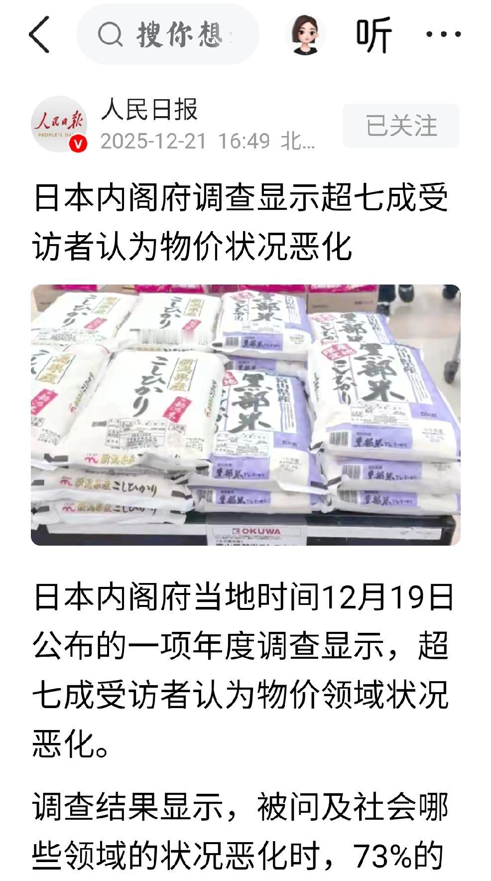 日本人口数据,说明日本国力持续下降。 个人观点:请看12月23日《朝日新闻》报道:日本今年新生儿人数约为66.8万人,是日本100多年来最低水平,而2024年这一数据是72.1万人,环比下降了7%。需要特别注明的是:2025年死亡人数高达一百六十万五千二百九十八人;同时,日本人口结构特点是65岁以上老人比重已达到29%。 此时此刻的日本物价恶化,生活成本高昂。 个人认为:日本社会已经进入超级老龄化社会,日本民众民不聊生,然而日本的官员却是反智反常识的举措,令人感到日本右翼势力正在急于挣脱束缚,绑架日本民众走向邪路。 举例说明: 日本政府严查涉外旅游业。个人认为:日本旅游业已处在衰退之中,整体行业困难,此时日本政府又在背后捅刀放血,日本旅游业雪上加霜。 日本贸易大臣要求发行1.78万亿日元特别债券,以帮助日本贸易保险机构支付日本对美国的投资。个人理解:这等于把日本政府对美国的投资,甩锅在日本国民身上。 日本30年以来金融政策转向,标志着日本陷入衰退。 日本农相的反智言论,令人不可接受。 个人认为:日本当前领导层的种种行为,已经对日本的国家利益造成了不可逆转的永久伤害。