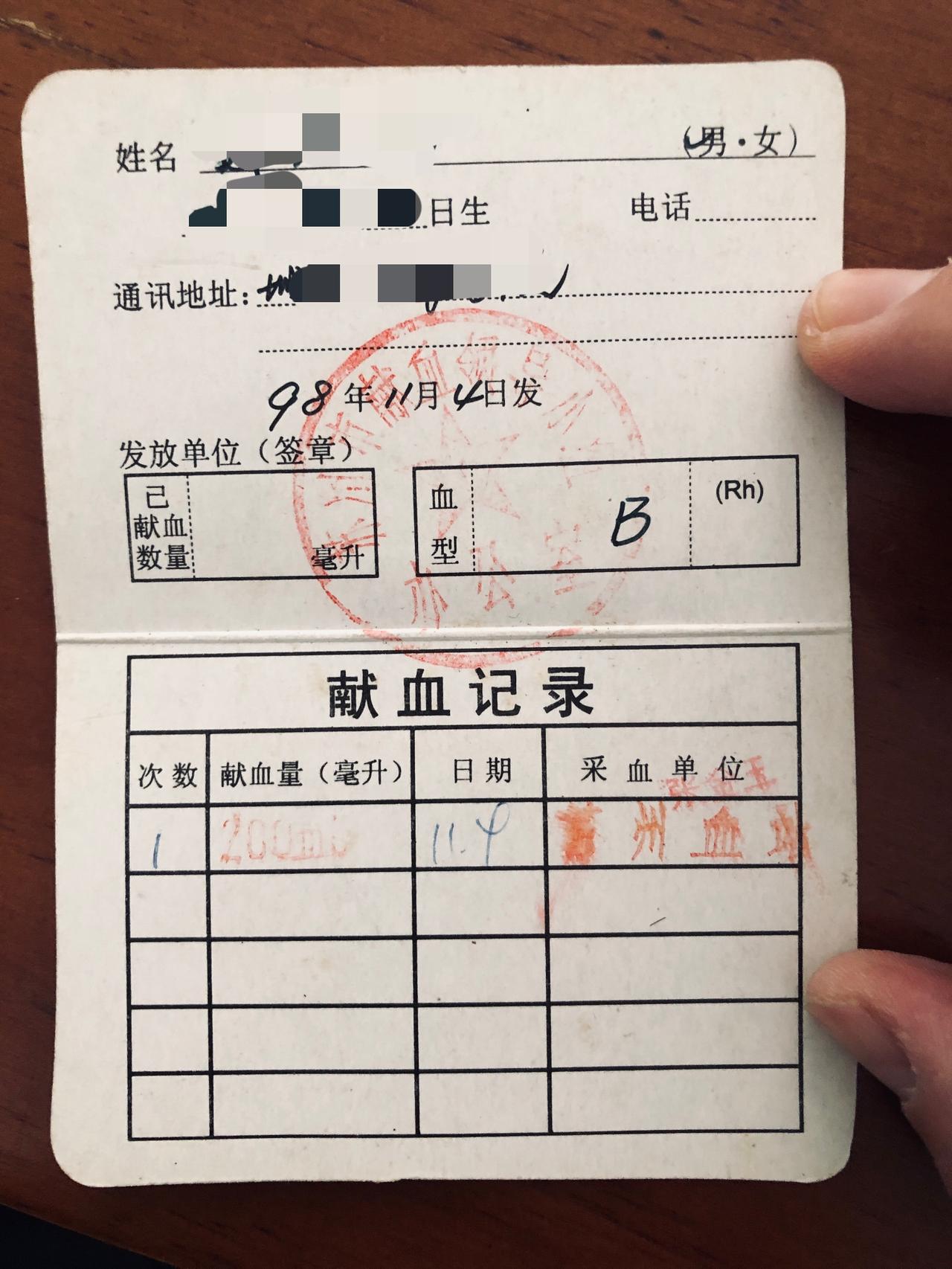 1998年大学里的献血记录。没有编号,没有钢印,没有防伪,没有存根,当年献血后补偿是一份蛋炒饭,说以后终生免费用血。现在如果拿这个去医院,那些人会理么?这就是当年的公信力,和庞莱臣家族捐给南博的凭据何其像。