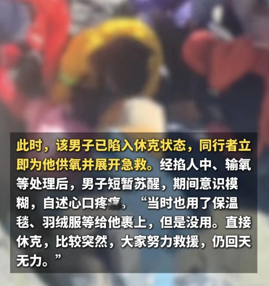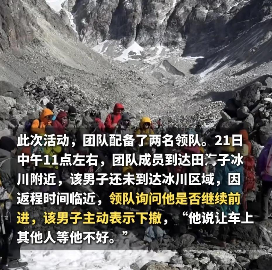 意外还是发生了!近日,一个23岁的小伙子,跟团去田海子冰川那边徒步,没想到有去无回。 这小伙子是个在读硕士,上周五报的团,就付了248块钱包车费,其他开销大家AA,团里配了两个领队。 那天中午11点左右,团队走到冰川附近了,他还没到目的地。因为返程时间快到了,领队就问他还要不要继续往前走。他自己主动说要下撤,还说“让车上其他人等不好”。 往回走的路上,一开始他看起来挺正常,还有说有笑的。走到一片乱石滩的时候,领队发现他没跟上,回头一看,他已经坐地上了。 领队赶紧过去,发现人已经休克了。旁边的人立刻给他吸氧、急救,掐人中、用保温毯羽绒服捂着……他中间短暂醒了一下,说自己心口疼,但意识模糊。 之后情况急转直下,从发现异常到没了呼吸心跳,也就二十多分钟,大家努力救,也没救回来。 领队后面说了些情况。这小伙子不是新手,是大学登山队的,爬过好几座5000米左右的雪山,还做过兼职领队。他这次根本没坚持硬扛,没到冰川就自己要求撤了。 领队推测,可能不是高反,更像是心源性猝死或者心梗,因为“高反没这么快”。 还有个背景是,其实当天,当地发了封山通告,因为进入防火期了,田海子这些地方不让进了。 而且早在11月,当地几个部门就联合发过公告,明确禁止在未开放区域开展登山、徒步这些户外活动。看样子,他们这个团进去的时候,封山规定可能已经生效了。 我翻到一条网友评论,挺有代表性的:“有经验的老驴反而更容易大意,觉得‘这路线我熟’、‘我身体扛得住’,有时候比纯粹的新手更让人担心。” 看了整个经过,心里挺不是滋味的。一个年轻、有经验、而且明明主动放弃了登顶、表现出责任心(怕耽误别人)的人,还是没躲过意外。 经验与危险的“悖论”? 我们常觉得“新手容易出事”,但有时恰恰是“有经验”带来一种无形的安全感,让人对细微的身体异常信号不那么警惕。他走过更难的路线,可能觉得这次徒步强度“根本不算事”,这种心理预设会不会掩盖了身体的真实预警? 猝死的“毫无征兆”。 领队提到心源性猝死可能。这玩意儿太隐蔽了,平时可能一点事没有,在高海拔、疲劳等应激状态下突然触发。它不分你是小白还是老驴,更像是一颗不知道是否存在、何时会响的“隐形炸弹”。这提醒所有户外的人,无论经验多丰富,对生命的敬畏心,必须时刻保持在最高位。 对此,你们怎么看?
