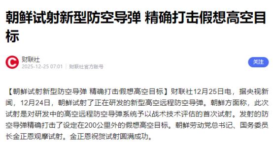 朝鲜终于出手了!金正恩亲自现身,一枚导弹砸向了日本海。   来自朝鲜官媒的最新消息:12月24日星期三,朝鲜人民军向日本海试射了一枚新型远程防空导弹。而且,当天朝鲜最高领袖金正恩也亲自现身,观看了这次试射,这让人民军将士们深受鼓舞。目前,日本防卫省正在努力评估各种数据,但至今也没有评估出个所以然来。   毕竟这次朝鲜试射的不是普通导弹,是正儿八经的新型远程防空导弹,打靶精准度直接拉满,命中了200公里高空的模拟目标,这个高度放在全球远程防空导弹里都算主流水平。   金正恩到现场这事更不简单,这相当于给外界递了个明确信号,朝鲜对这款武器的性能相当自信,也没打算藏着掖着。   可能有人觉得不就是试个导弹吗?没必要这么大惊小怪。但了解半岛局势的人都清楚,这波操作背后全是门道。最近一段时间,美韩联合军演搞个不停,各种先进武器轮番亮相,明眼人都知道是在给朝鲜施压。   朝鲜之前也通过不少方式表达不满,这次试射新型远程防空导弹,就是用最直接的方式回应,意思很明确:你们搞军事威慑,我就强化国防实力,别想随便拿捏。   朝鲜官媒后续补充报道,这次试射的核心目的是全面检验这款新型防空导弹的综合战斗性能,包括发射架的稳定性、雷达的探测精度以及战斗综合指挥车的协同能力。   从最终结果来看,所有指标都达到了预设标准,试射圆满成功。金正恩在现场还专门对研发和参演人员表示祝贺,强调这款武器的列装将大幅提升朝鲜的防空反导体系实力,为国家主权和领土完整加上一道“安全锁”。   日本这边的反应特别有意思,导弹刚落进日本海,防卫省就紧急启动了数据评估程序,调动了不少监测设备,折腾了好几天也没拿出个靠谱的评估报告。   不是他们能力不行,主要是这款导弹用了不少新技术,比如双打控制技术和双重脉冲飞行发动机,这些技术大大提升了导弹的反应速度和制导精准度,日本之前没接触过相关技术参数,自然摸不清底细。最后只能含糊其辞地说“正在持续分析”,场面多少有点尴尬。   韩方的反应则显得有些紧张,国防部第一时间召开记者会,说已经密切关注朝鲜的动向,还强调“这会加剧半岛紧张局势”。   可朝鲜这边根本不吃这一套,直接回怼说这是正常的军事训练,美韩把正常训练说成威胁,纯属贼喊捉贼。毕竟美韩军演的规模一次比一次大,朝鲜搞个导弹试射提升防卫能力,本质上就是自保,没毛病。   从技术层面看,朝鲜这次能试射成功,也能看出其军工体系的进步。要知道远程防空导弹的研发难度极大,涉及多个技术领域,不是随便哪个国家都能搞成的。   朝鲜之前就一直在深耕防空武器领域,比如之前装备的KN-06防空导弹,就具备同时跟踪100个空中目标的能力,这次的新型导弹相当于在原有基础上实现了升级,抗干扰性和拦截范围都有了明显提升。   更值得注意的是这不是朝鲜近期第一次搞武器测试,就在这次试射导弹之前,金正恩还多次亲临现场,指导无人武器的性能试验,包括战略侦察无人机、自爆式无人攻击机等,还专门指示要尽快构建批量生产体系,让这些装备形成实战能力。看得出来,朝鲜正在全方位强化军事力量,每一步都走得很扎实。   国际社会对这事的看法也不一样,中国方面一直强调,希望有关各方保持冷静克制,通过对话协商解决分歧,共同维护半岛及周边地区的和平稳定。   有国际问题专家分析,朝鲜这次试射导弹,既是对美韩军事施压的回应,也是为了凝聚国内民心。毕竟在复杂的国际环境下,强大的国防实力是国家稳定的重要支撑,朝鲜通过展示军工成果,能进一步提升民众的凝聚力。   现在半岛局势本来就很敏感,这次导弹试射无疑会让局势再添几分紧张。但明眼人都知道,朝鲜从来不想主动挑事,所有军事行动都是为了自卫。美韩要是真的想解决问题,就该停止无休止的军演,坐下来和朝鲜好好谈。要是继续用施压的方式,只会让矛盾越来越深。   至于日本防卫省啥时候能拿出评估报告,现在还不好说。但有一点可以肯定,经过这次试射,朝鲜的国防实力又上了一个台阶,以后美韩再想对朝鲜指手画脚,就得好好掂量掂量了。   金正恩亲自现身观摩,说白了就是给外界划红线:朝鲜的底线不能碰,谁要是敢挑衅,就得承担相应的后果。这波操作,既展示了实力,又传递了态度,不得不说,朝鲜这步棋走得相当稳。