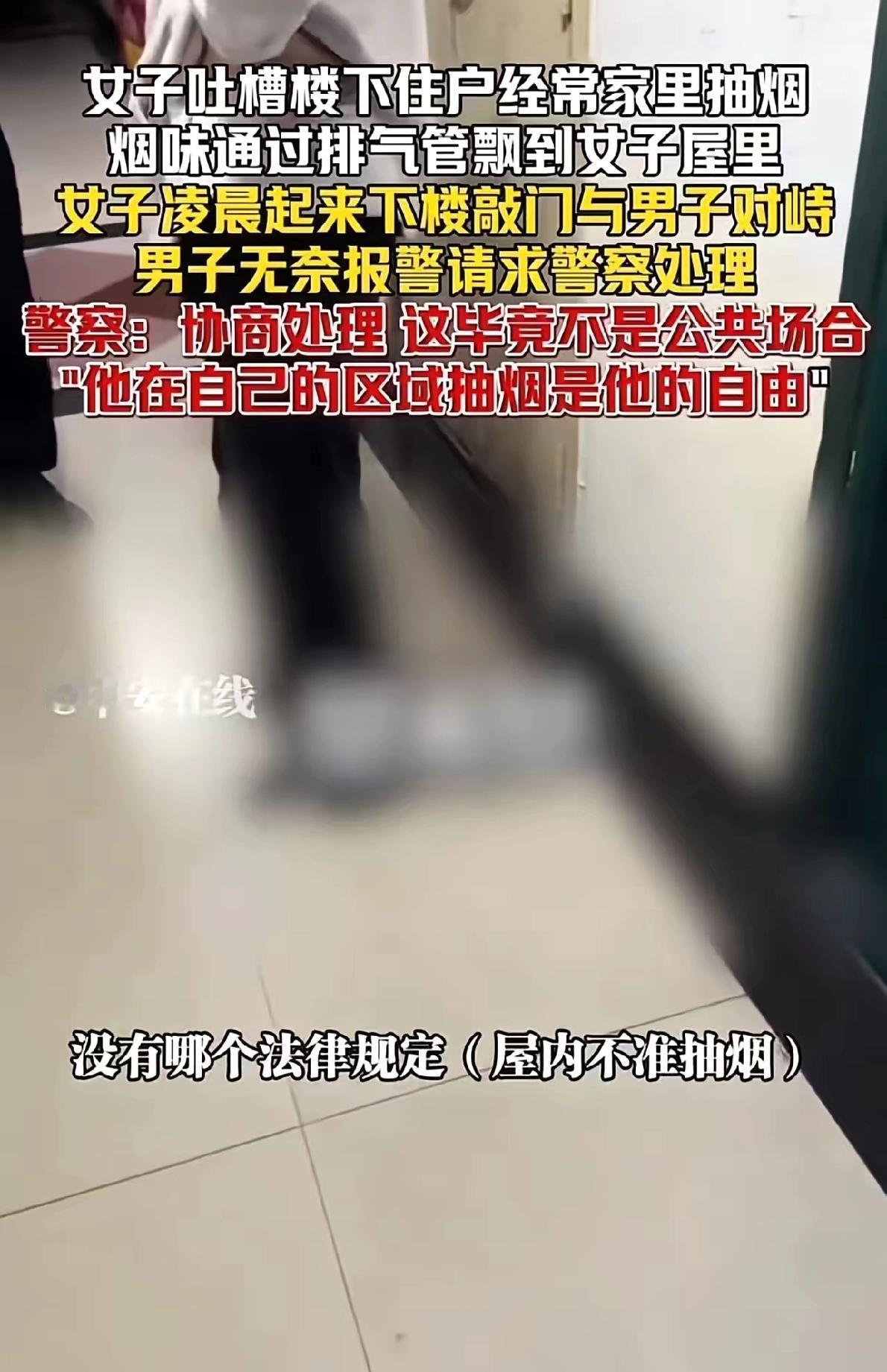 小仙女这事真的无敌了! 四川一男子在家抽烟,楼上女邻居直接上门开怼,张口就骂人家傻叉,说烟味顺着排气管飘到自家。 男子当场懵圈,我在自己家抽烟,你管得着? 让她有本事去报案。 民警来了之后,女子直接傻眼! 民警直言,人家在私人空间抽烟不违法,要沟通就好好说。 这女的不是第一次找茬了,大清早五点半,人家睡得正香,她闻着烟味就上门咆哮。 事后还把事儿发网上求评理,结果被网友吐槽手伸太长。 我觉得吧,讨厌烟味没错,但上来就人身攻击,纯属激化矛盾。 男子虽说没违法,可多考虑下邻居感受,换个通风好的地方抽,也不至于闹成这样。遇到这种邻里矛盾,你觉得该咋妥善解决?