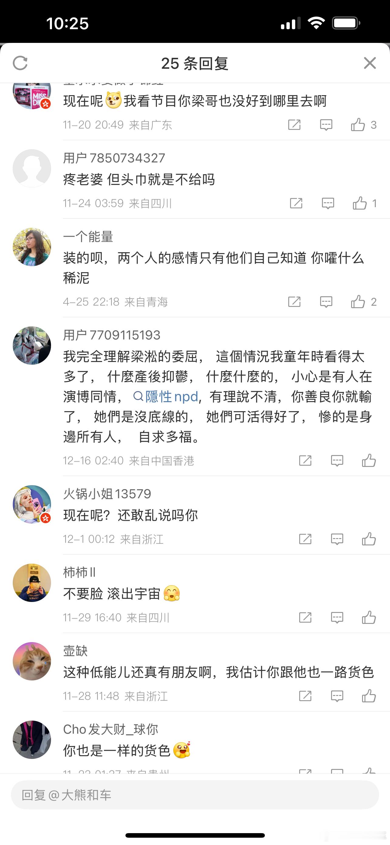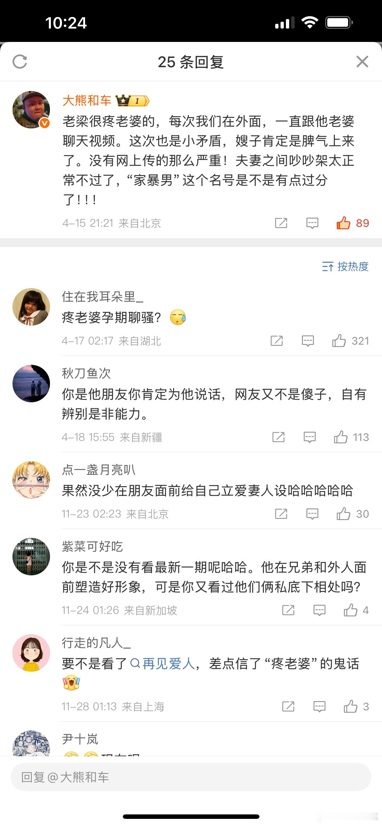 再见吧爱人最近贼火,其中这一季里面最受争议的夫妻梁老师,恰好是我的好朋友!图片是4月份,家暴门,我替老梁说话的微博,然后11月份他俩的事情又火了,最新一期,老梁的口碑又被反转了!大家看看网友的评论,真是见风就使舵啊!再见爱人梁淞何美延吵架片段
