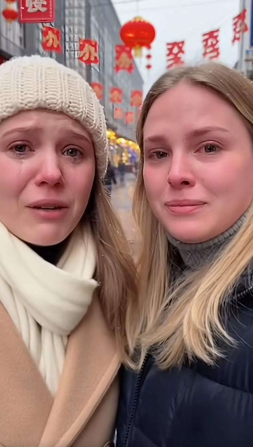 两位乌克兰美女在大街上对着镜头用中文哭着说,因为战争,我们来到中国,家人都在不了,在这里很好,不少人安慰我们,还给我们吃的住的,我们真的很爱中国,希望不要再有战争!