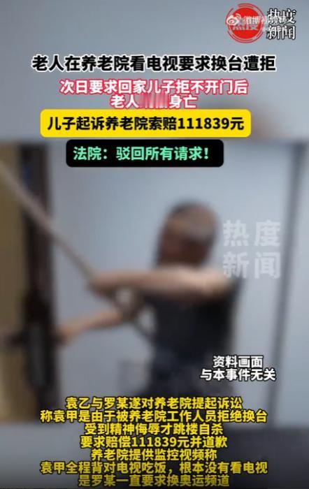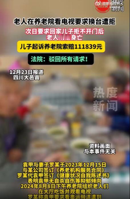 四川大邑,儿子将双亲赶出家门,两老被迫住到养老院,儿子不闻不问,8个月后,父亲自觉将不久于人世,独自从养老院返回儿子家,在门口敲门半天,儿子一想到父母分割房产不公,冷漠把他拒之门外,父亲报警处理,儿子依然不为所动,父亲心寒不已跳楼身亡。事后,儿子和母亲把养老院告上法庭,索赔11万余元,理由是父亲想看喜欢的电视频道,被工作人员拒绝自尊心受阻,才想不开。法院判决出人意料。 2024年8月11日的清晨,72岁的袁甲独自离开了居住八个月的养老院,脚步蹒跚地朝着儿子袁乙的家走去。 他走得很慢,心里却揣着一丝期待,觉得自己这么久没见儿子,对方就算之前有隔阂,见了面总能软下心来。 到了袁乙家门口,袁甲先是侧耳听了听,里面传来儿子说话的声音,他一下子松了口气,随即用力敲起了门,大声喊着袁乙的名字。 可屋里的声音瞬间就没了,门始终紧闭着,没有任何要打开的迹象。 袁甲没放弃,拿出手机给儿子打电话,电话接通的瞬间,他急忙说自己从养老院回来了,想进屋看看。 可袁乙一听到他的声音,二话没说就挂了电话。 他又一次拨过去,声音带着难以掩饰的颤抖和虚弱,跟袁乙说自己感觉快不行了,不想死在养老院,就想在家中度过最后时光。 没想到这句话反而激怒了袁乙,电话里传来儿子不耐烦的怒吼,翻起了之前房产分配的旧账,两人在电话里吵了起来,袁乙态度坚决地说不会给他开门。 绝望之下,袁甲拨通了报警电话,跟民警说自己和儿子闹了矛盾,被拒之门外。 可没等民警赶到,短短半个小时里,袁甲心里的最后一点希望也熄灭了,他从楼上一跃而下,当场就没了气息。 谁也没想到,这场悲剧的根源,早在一年前就埋下了伏笔。 袁甲和老伴罗大娘就只有袁乙这一个儿子,原本一家人的日子也算过得去,直到房产分配的事情出现分歧。 袁甲夫妇把一处房产分给了他们的侄子,这个决定让袁乙无比愤怒,在他看来,自己是父母唯一的儿子,所有财产都该由他继承。 于是,他和父母的关越来越差,最后甚至吵到了断绝关系的地步,2023年12月,彻底寒心的袁乙做出了一个狠心的决定,把年迈的父母赶去了养老院。 12月15号那天,罗大娘搀扶着颤巍巍的袁甲,跟养老院签下了养老服务合同,还代替袁甲填写了健康状况自我陈述书,上面写着袁甲没有自杀、自伤的抑郁倾向。 在养老院的日子里,袁甲总想着回家,想着能和儿子缓和关系,这份念想成了他心里最放不下的牵挂。 2024年8月8号那天,工作人员组织大家看电视,袁甲提出想把频道换成奥运频道,工作人员看只有她一个人有这个需求,就没同意,继续播放着大家都喜欢的节目。 袁甲的情绪从这之后就变得有些低落,闷闷不乐的,或许是对回家的渴望越来越强烈,又或许是心里的委屈无处诉说。 袁甲死后,袁乙和罗大娘一起把养老院告上了法庭,索赔11万元,他们认为,是因为养老院工作人员拒绝换台,才导致他想不开轻生。 法庭上,养老院拿出了当天的监控录像,清晰地还原了当时的场景,还表示从来没有对袁甲有过任何语言或身体上的不当行为。 法院经过调查审理后认为,没有任何证据能证明养老院存在侮辱、谩骂袁甲的行为,换台的争议也和事实不符,养老院已经按照协议履行了自己的服务职责,对袁甲的死亡没有过错,不需要承担侵权责任。 真正导致袁甲轻生的原因,是他因为房产问题和儿子产生矛盾,返家被拒后又报警无果,最终因心寒至极才做出了极端的选择。 一场房产分配的分歧,彻底割裂了父子间的亲情。 袁乙始终纠结于父母没有把财产全部留给自己,却忘了父母养育他长大的恩情。 袁甲或许有自己的考量才把房产分给亲戚,可能是亲戚曾对他有恩,也可能是早就对儿子的态度寒了心。 可这份掺杂着财产的矛盾,最终让两个最亲近的人走到了无法挽回的地步,也让袁甲的最后心愿,成了永远的遗憾。