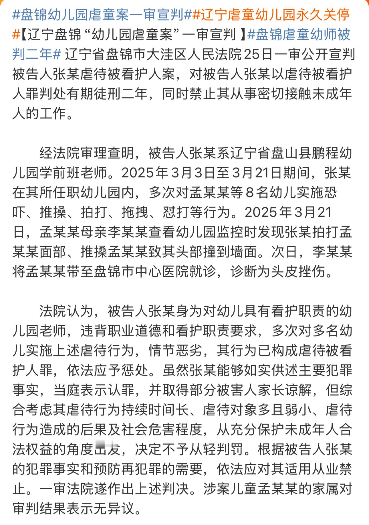 划重点:第一、张某如实供述主要犯罪事实,当庭表示认罪,并取得部分被害人家长谅解。第二、综合考虑其虐待行为持续时间长、虐待对象多且弱小、虐待行为造成的后果及社会危害程度,从充分保护未成年人合法权益的角度出发,决定不予从轻判罚。第三、根据被告人张某的犯罪事实和预防再犯罪的需要,依法应对其适用从业禁止。没有考虑从轻判罚,就是在照顾公众的情绪以及虐待行为给孩子带来的后果,从法律上来讲是合适的,也得到了当事家属的认可。幼儿园虐童案一审宣判家长最新回应热点观点 幼儿园虐童案一审宣判家长最新回应
