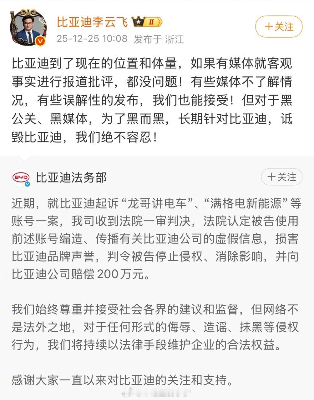 法院判决自媒体赔偿比亚迪200万元 比亚迪最近赢了一场网络维权官司!法院认定“龙哥讲电车”等账号编造虚假信息抹黑比亚迪,判赔200万还得公开道歉。比亚迪回应很硬气。欢迎监督和批评,但黑公关、长期造谣绝对不惯着。这次胜诉不仅是为自己讨回公道,也给行业提了个醒——网络不是法外之地,乱喷是要付出代价的。小梦说车
