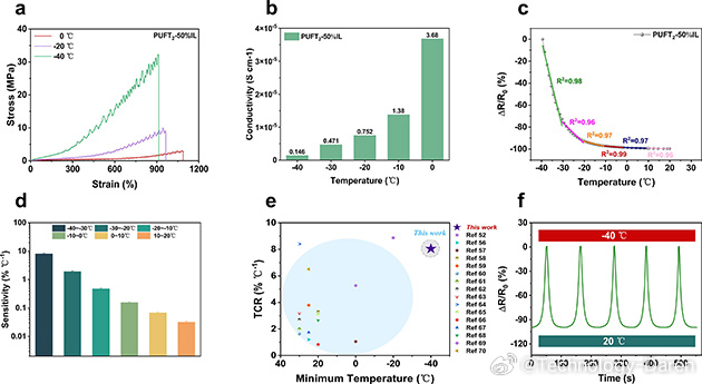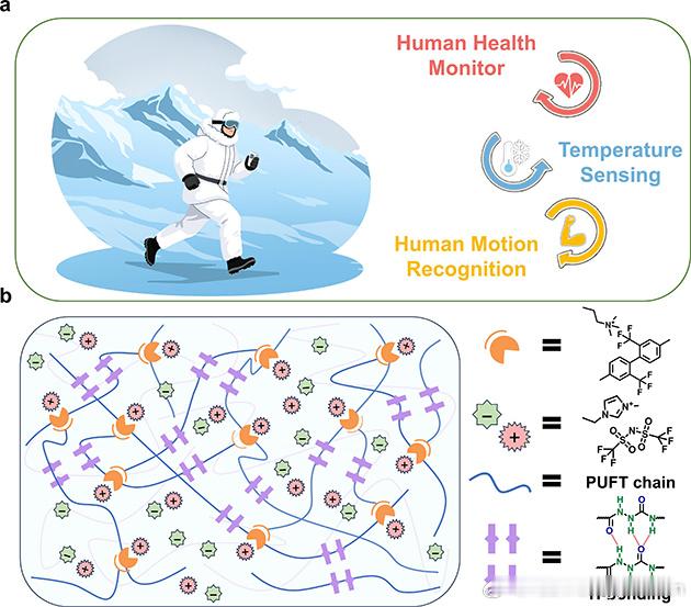 最新科技消息 【我国研发出极地可穿戴设备用超敏多功能材料】近年来,中国科学院兰州化学物理研究所兰州润滑材料与技术创新中心聚合物自润滑复合材料课题组对聚氨酯材料的分子设计、性能突破和功能化集成进行了深入研究,开发出了多种具有巧妙分子设计的多功能形状记忆聚氨酯材料。众所周知,强化学交联赋予高力学性能但牺牲了动态性与可修复性,而柔性设计利于功能实现却往往导致强度或者可拉伸性不足。针对这个问题,研究团队将两者相结合,通过引入物理交联和化学交联,在聚氨酯内部构筑交织网络结构(ACS Appl. Mater. Interfaces. 16(35) (2024)046822–46833)。具体来说,四重氢键能有效的耗散能量,而交织网络结构则能在外力作用时稳定分子网络。这种分子网络设计不仅在提升聚氨酯材料强度的同时,没有以牺牲弹性为代价,还能赋予聚氨酯动态特性,能实现诸如形状记忆、自修复和可回收等功能特性。为探索聚氨酯材料的应用潜力,基于上述研究,研究人员对聚氨酯材料内部分子网络设计和功能化进行深入研究。为实现材料的导电性,引入更多具有额外极性的极性键是一种可能的策略,如碳-氟(C-F)键。由于F原子的高电负性,C-F键的强静电性质会增强进入体系的电子极性,这样阴离子和阳离子可彼此分布得更远,在聚合物内部移动更自由。基于此,研究人员提出了一种分子工程范式,利用氟的双重功能在聚氨酯基质中构建空间相关但功能独立的动态网络。通过引入含氟扩链剂和多氢键单元,构建了氟-阳离子相互作用与高密度氢键协同的动态网络,氟的高电负性不仅与封端剂形成离子键增强网络稳定性,还通过偶极相互作用固定阳离子,构建阴离子传输通道,保障离子高效迁移。从而成功制备了一种具备超敏感多参数监测功能,可用于极地可穿戴设备形状记忆聚氨酯材料。针对极地等极端环境的挑战,团队重点测试了材料的低温耐受性。在-40℃时,材料仍能保持较高的强度、韧性、可拉伸性和离子电导率。此外,该材料表现出负温度系数行为,在-40℃至-30℃超低温区间的温度系数电阻高达8.05% ℃-1,且在连续热循环测试中表现出良好的稳定性和可重复性,彰显了其在深冷环境下可靠应用的潜力。作为高灵敏、可自修复的“离子皮肤”,该材料在健康监测方面表现卓越。实验证明,它能精准监测手指、手腕、肘部等关节的不同弯曲动作,并区分深、浅不同的呼吸模式。尤为关键的是,当用作心电图监测电极时,它采集的信号质量符合临床要求。这一巧妙的分子设计为极端环境下柔性电子设备的设计提供了新的聚合物工程策略,突破了传统材料的性能权衡限制。相关成果以“Shape-memory polyurethanes for polar wearables with ultrasensitive multi-monitoring”为题发表在Nature Communications上,兰州化物所陈天泽博士为论文第一作者,张新瑞研究员和徐静博士后为共同通讯作者。网页链接以上工作得到了国家自然科学基金委、中国科学院青年科学家基础研究项目、中国科学院青年创新促进会、中国科学院战略性先导科技专项(B类)等的支持。