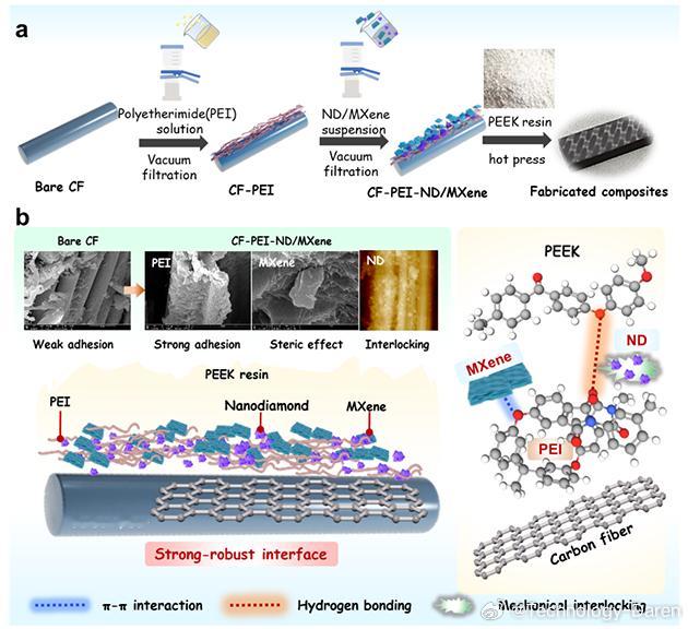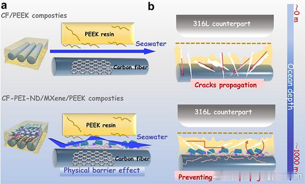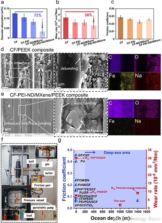 最新科技消息 【我国在深海润滑材料研究获新突破】深海装备中的轴承、阀门、齿轮及轴套等关键运动部件,长期直接暴露于深海严苛环境服役,承受随深度线性快速增加的海水压力,导致聚合物润滑材料面临高压海水加速老化与复杂摩擦磨损耦合作用的严峻挑战。碳纤维织物增强聚合物复合材料具有优异的比模量与比强度,在深海应用中展现出巨大潜力。然而,与均相复合材料相比,其内部大尺度的连续纤维-树脂界面,在高压下易成为海水渗透与扩散的快速通道,制约了其在深海环境中的进一步应用。针对这一难题,中国科学院兰州化学物理研究所润滑材料全国重点实验室聚合物摩擦学课题组,围绕深海环境下聚合物复合材料的损伤机制、组分设计及摩擦学行为开展了系统性研究。近期研究揭示,深海环境对聚合物复合材料的主要损伤形式表现为树脂基体微缺陷的生成与界面层厚度的显著增加。研究发现在30 MPa高压下,材料饱和吸水率仅从常压的4.0%小幅增至4.4%,但其层间剪切强度却急剧下降60%,磨损率增加近3倍,表明性能退化与整体吸水量并非简单线性关系,其深层机理在于海水渗透与深海压缩效应相互竞争,高压虽限制整体吸水,但水分子聚集于树脂微缺陷及纤维-树脂界面孔隙中,导致在外部应力下局部缺陷更易扩展为裂纹;同时引发界面损伤,表现为界面厚度从初始1.1μm大幅增加至2.5μm(图1)。针对深海特异性损伤机理,课题组创新性地提出了一种强韧化界面增强策略。研究人员采用真空辅助压力渗透技术,在碳纤维织物表面成功构筑了一种“刚-柔”并济的杂化强韧界面结构(图2)。以聚醚酰亚胺为柔性相,发挥柔性粘接与应力缓冲作用;以纳米金刚石和二维MXene为刚性相提供物理阻隔与机械互锁点,协同抑制海水渗透扩散、促进应力高效传递(图4,5)。模拟深海高压环境的原位摩擦磨损测试结果表明,这种有机/无机协同的界面设计,能显著提升复合材料在极端环境下的耐磨损性能(图3)。在模拟1000米深海压力下,制备复合材料的摩擦系数与磨损率均为目前文献报道的同类材料最低值,为解决深海运动部件材料损伤防护与应用提供了新思路。相关成果以“Carbon fabric/polyetheretherketone composites for deep-sea applications:enhancement of strong-robust interface”和“Response of seawater lubricated fabric-reinforced phenolic resin composites under high hydrostatic pressure”为题分别发表在Composites Part A: Applied Science and Manufacturing和Polymer Degradation and Stability上。范艺豪博士为论文第一作者,刘昊副研究员和王建章研究员为共同通讯作者。上述研究工作得到了国家自然科学基金、中国科学院战略性先导科技专项和国家重点研发计划项目的支持。网页链接网页链接