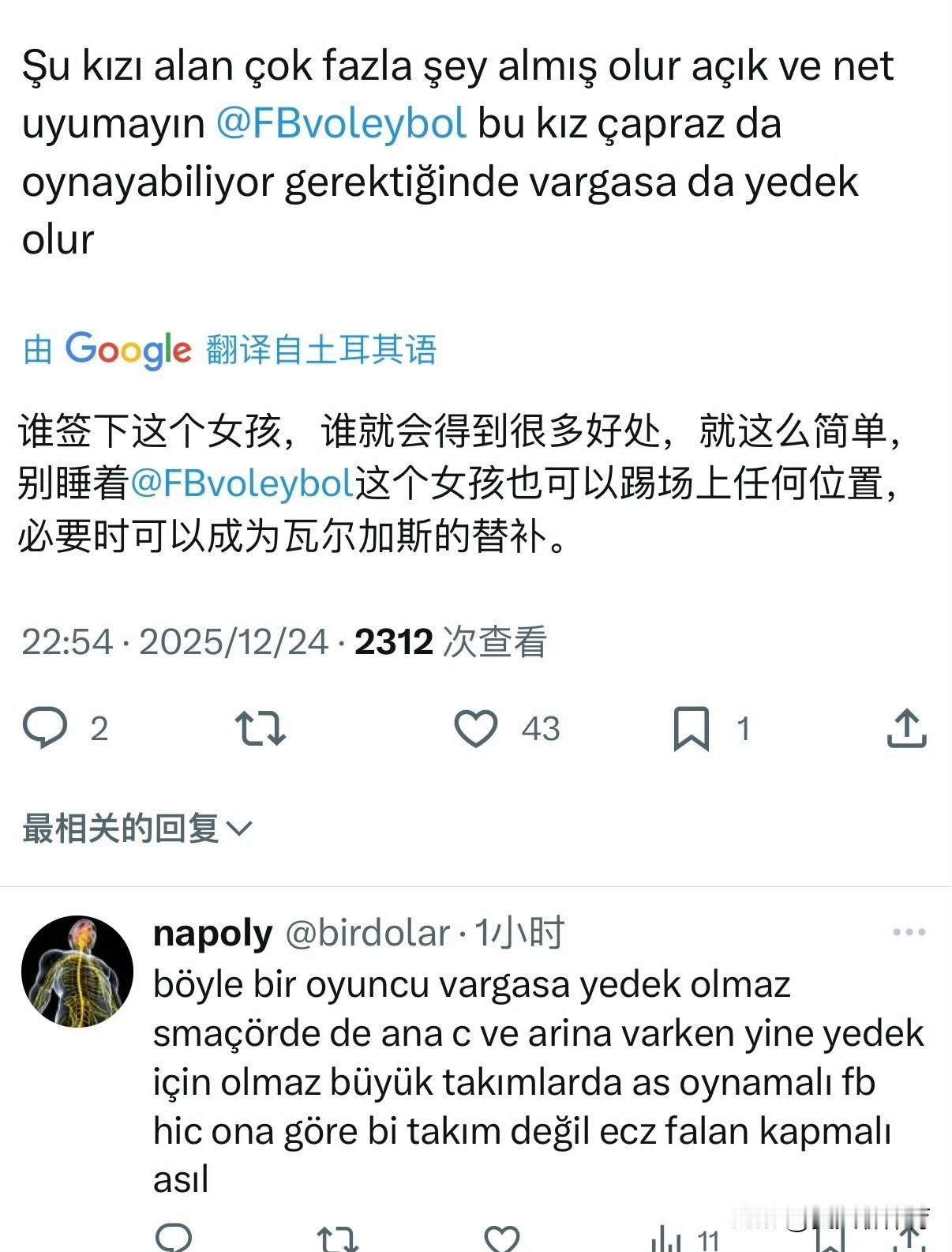 吴梦洁昨晚上5局大战35分,已经吸引了国外球迷的注意!话说土耳其球迷这么关注我们中国的联赛吗?还@土耳其豪门俱乐部费内巴切、瓦基弗银行等来把吴梦洁给引进队中,还说让吴梦洁去当瓦尔加斯的替补,还夸赞我们中国女排的主攻手后备力量比较充足!希望江苏女排也快点放人,让吴梦洁去土耳其或者意大利也去锻炼锻炼!