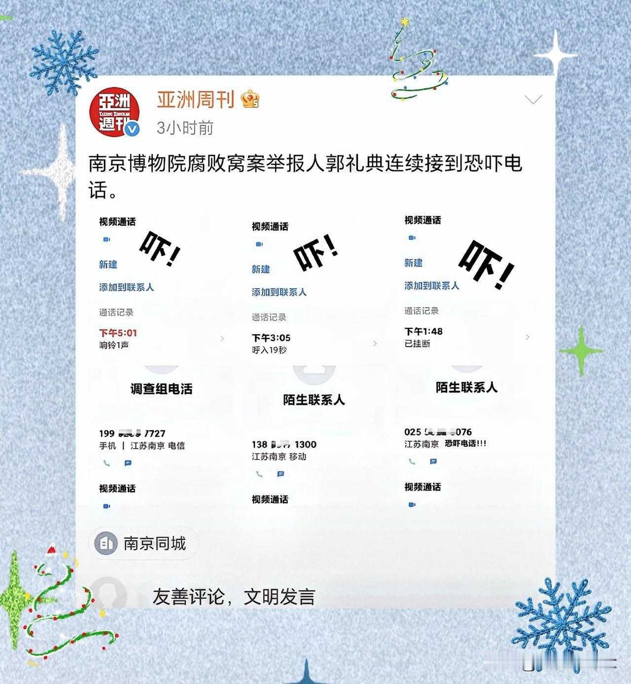 近几日,郭礼典因接到恐吓电话而感到不安,这背后隐藏着一个更大的问题——博物馆举报人的安全和社会正义的维护。 你是否也曾想过,在追求真相的道路上,为什么有些人要用恐吓来阻止声音的传播? 让我们一起深入探讨这一现象,看看如何恢复公众的信任。 调查的重要性和公众信任的恢复 近日,郭礼典接到一个19秒的恐吓电话后不敢再接陌生电话,令人心惊。 根据电话内容显示,对方警告他“不要乱说话”之后便挂断。 郭礼典表示,他感到很恐惧,不敢再接陌生电话了。 正当我们为郭礼典的遭遇感到惋惜时,郭礼典提及,今年以来他接到过多次类似恐吓电话。 有相关人士表示,南京博物院部分举报人近期接到过警告性质的来电,内容多为“不要乱说话”。 社会乱象的反映和对正义的支持 对此,郭礼典表示,今年以来,类似的恐吓电话他接到过好几个,他说:“我们以前接到的恐吓电话很少,今年特别多,这些人比旧社会的土匪还可恶。” 郭礼典还提到,目前文物领域相关问题正受关注,“我们不能因为这件事情损害相关形象,所以强烈要求对相关博物馆的问题开展全面调查。” 网友对此纷纷表示支持,呼吁由内地相关监管和调查部门介入彻查,以确保事件的公平公正。 有网友质疑现行的电话实名制,认为其在落实中存在漏洞,“对普通百姓实行电话实名制,对不法分子却监管不足,这公平吗?” 还有网友呼吁大家要对不法行为保持警惕,维护社会正义。 郭礼典等举报人的遭遇让我们看到了社会阴暗面的一角,正义的呼声不应被恐惧压制。 我们每个人都应对这种不法行为保持警惕,积极发声。 你怎么看待这种现象? 欢迎在评论区分享你的看法,别忘了点赞支持正义的声音郭礼典是南京博物院退休职工,已实名举报相关问题十年,近期确因接到多次“不要乱说话”的恐吓电话感到恐惧,