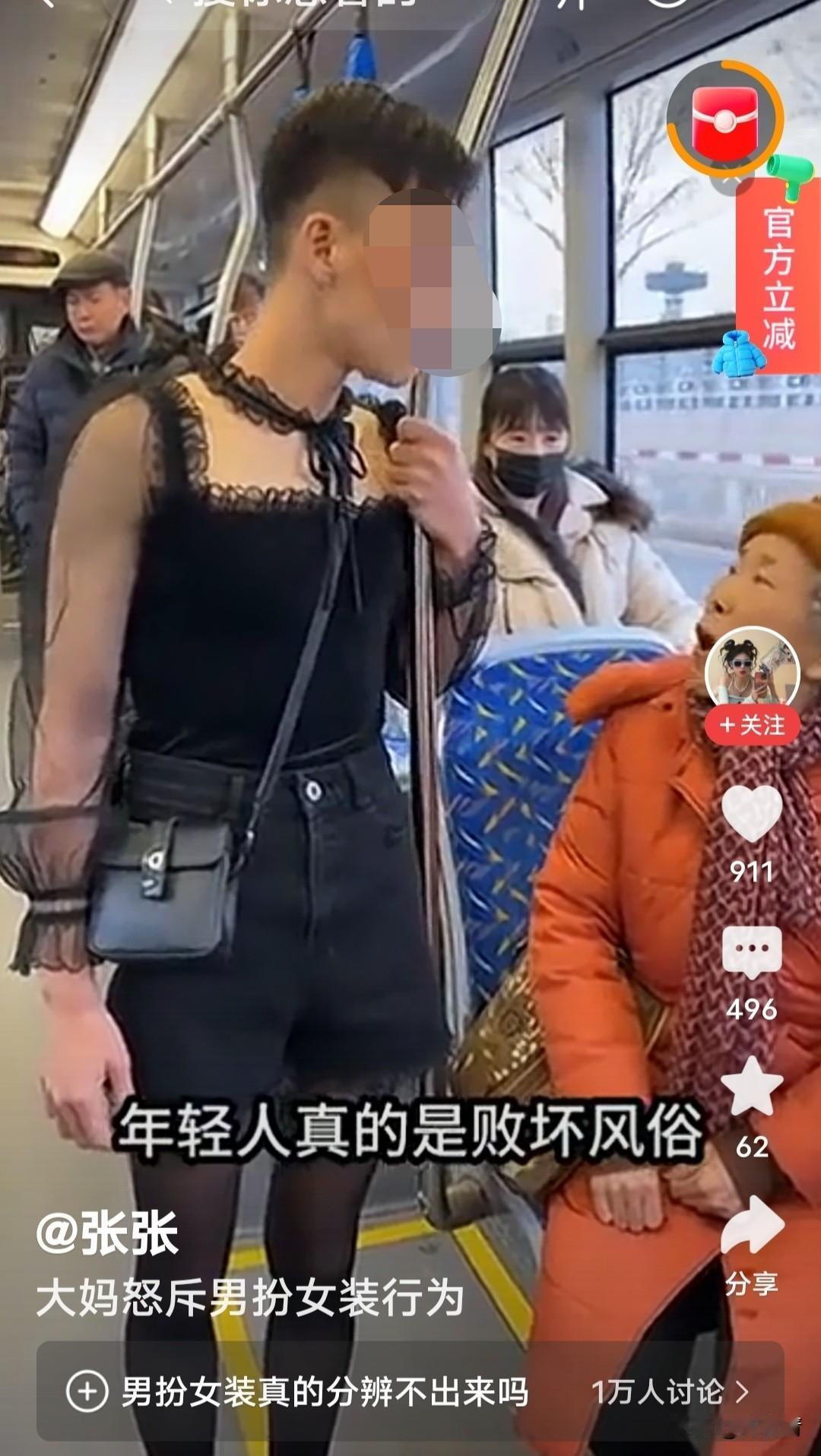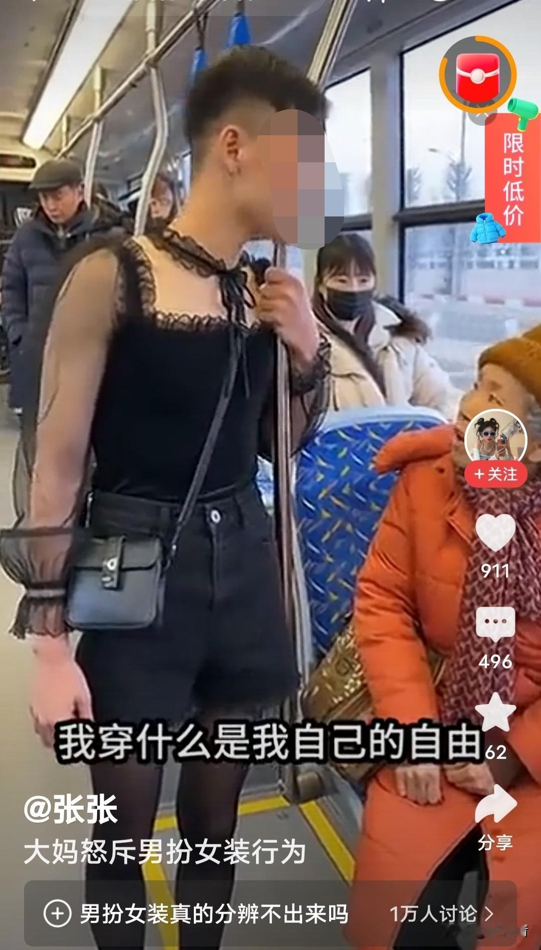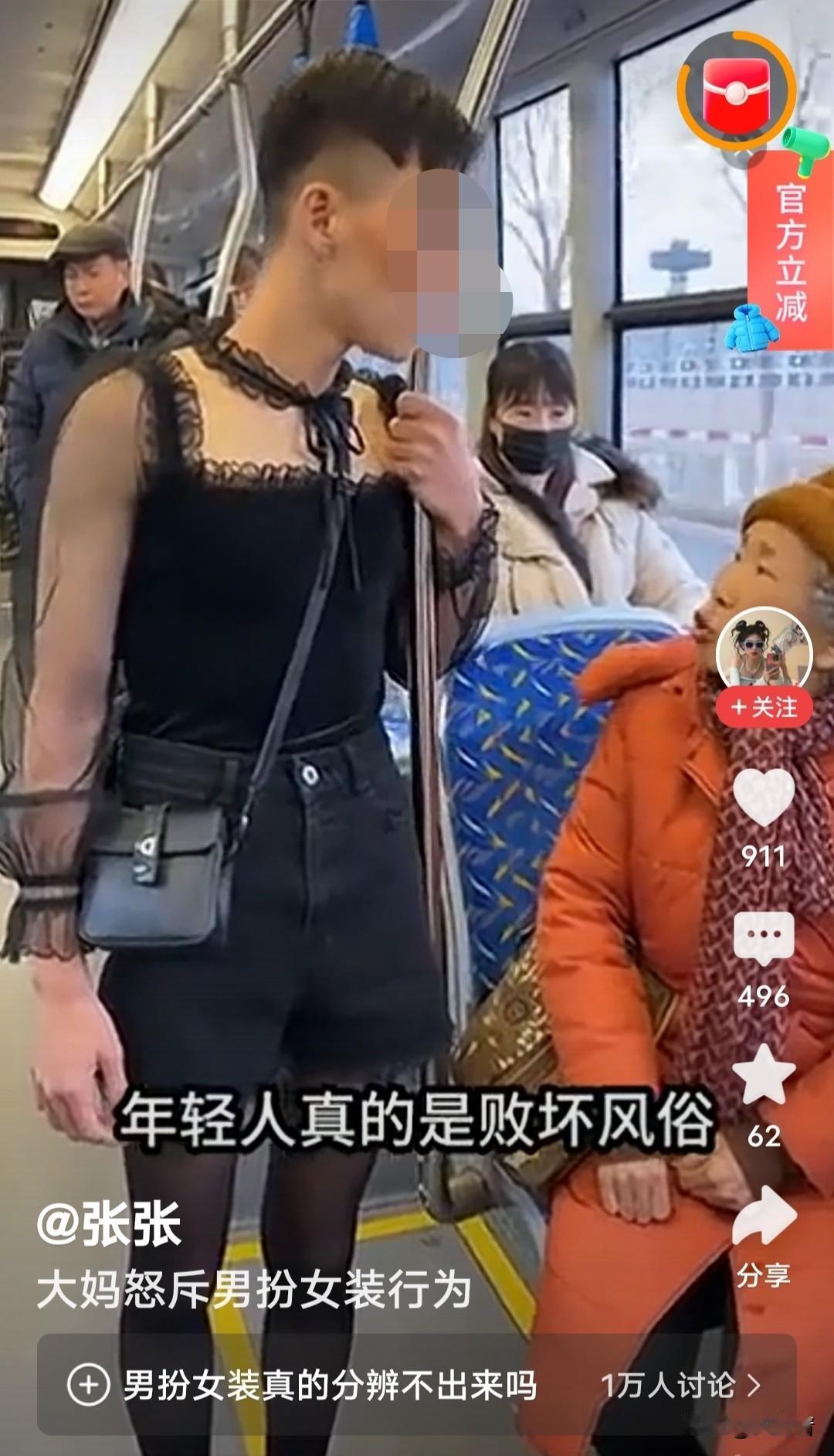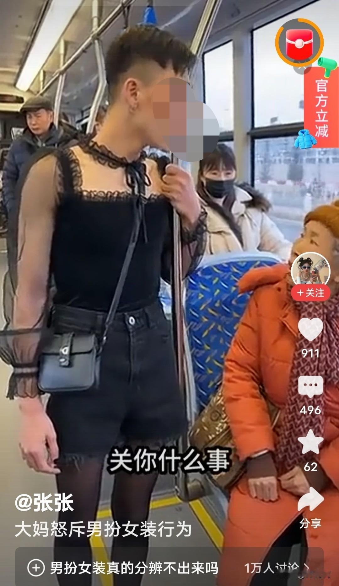 小伙子女性打扮,被大妈“呛”的不轻,他气得眼睛一瞪一瞪的。 这是公共地铁上,大妈在座位上坐着。小伙黑色短裤、吊带衫、黑丝袜、挎小包女性打扮。 大妈眼睛直勾勾的瞪着他。她意思就是这人咋这样穿呢?小伙子让她看的不好意思,就质问大妈?“你干嘛这样看着我?” 这下给大妈惹毛了。机关枪似的数落他;“年轻人真的败坏社会风俗,穿的人不人、鬼不鬼的,一点阳刚之气都没有!一个大老爷们穿什么衣服!” 柔性小伙只顾挡驾;“眼睛长在你脸上可以不看!穿啥衣服是我的自由,关你什么事?”你听听,小伙子急眼了。 各方观点;“应该对这种伤风败俗严厉打击!以正视听,维护三观。” “这事情两个人都不对,人家穿什么衣服跟你没关系,对方看不看也是他的自由,都没权利指责对方。” “虽说穿衣服自由,但违背公序良俗就是你不对啦。” “要是我儿子,揍得他满地找牙,没有一点男人的样子!” “支持大妈,声讨这个变态男。” “既然看不惯,但也不违法,最好不要干涉!每个人在法律范畴内都有自由。”你的观点如何呢?