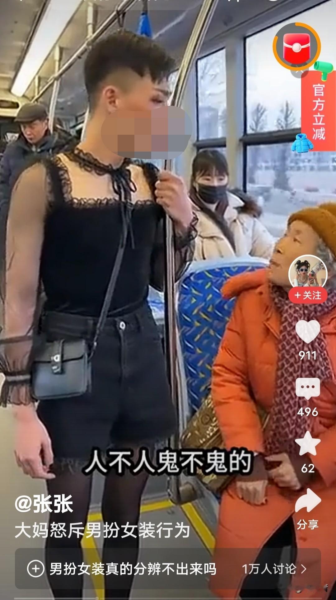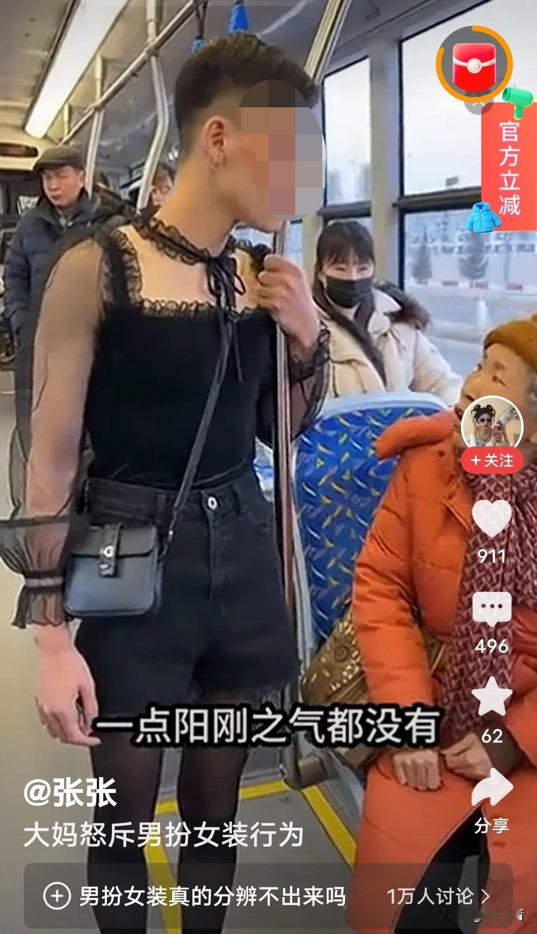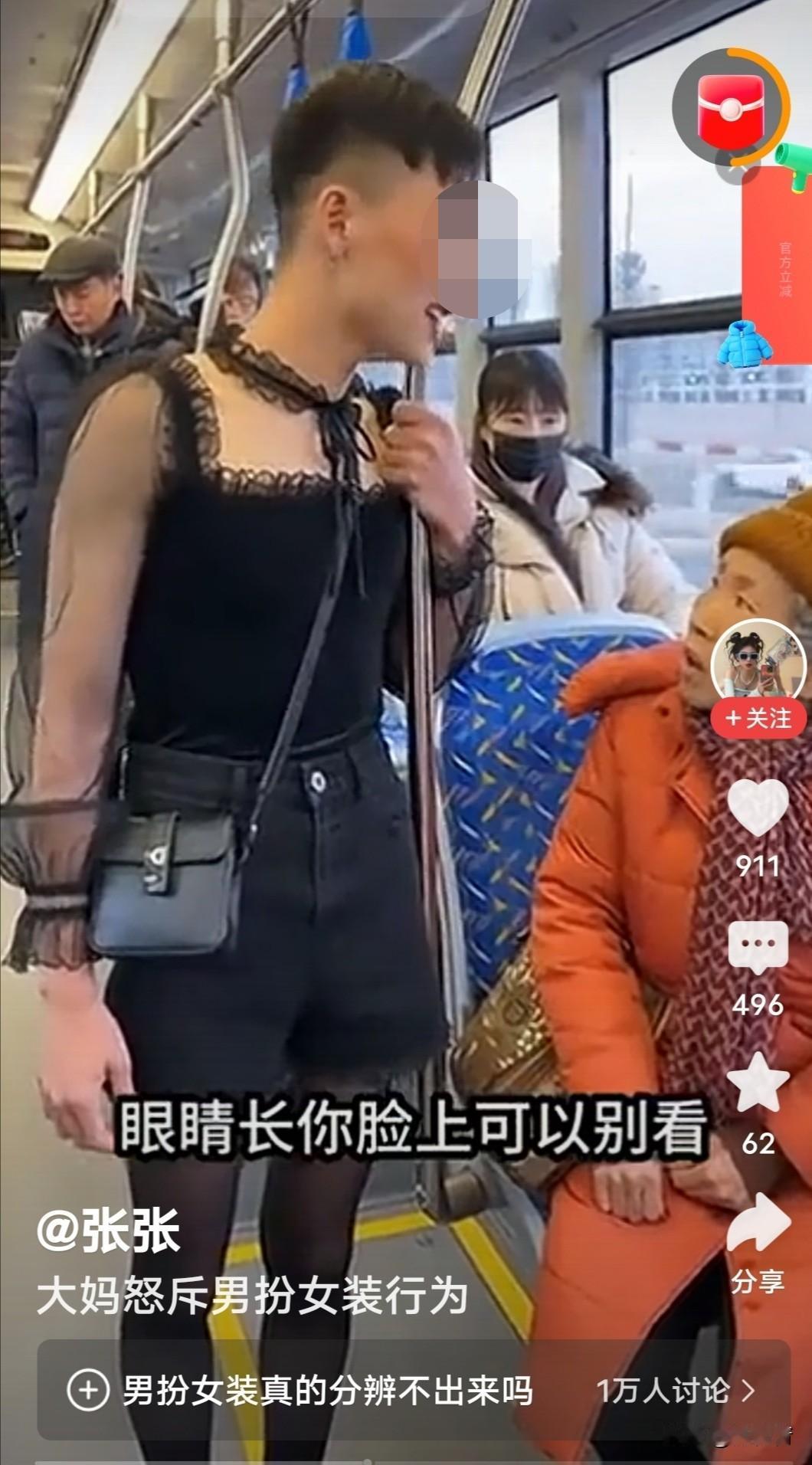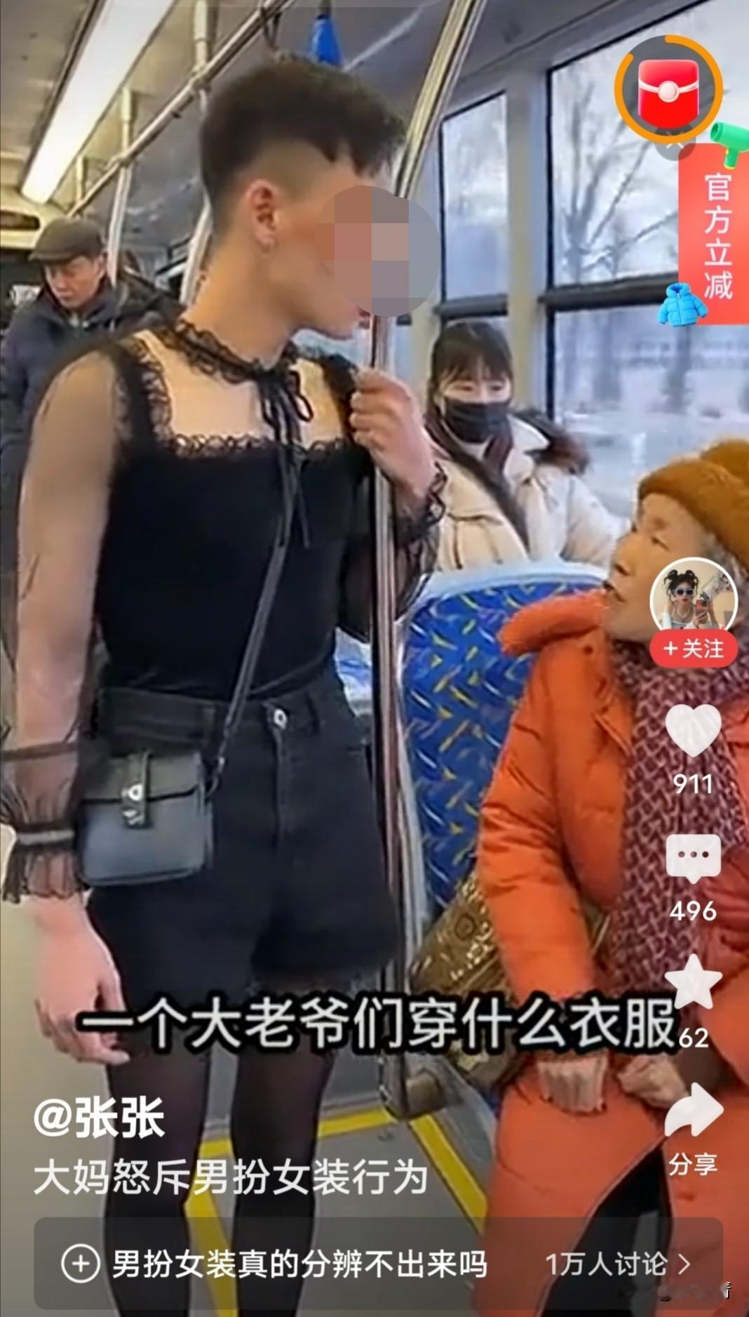 小伙子女性打扮,被大妈“呛”的不轻,他气得眼睛一瞪一瞪的。 这是公共地铁上,大妈在座位上坐着。小伙黑色短裤、吊带衫、黑丝袜、挎小包女性打扮。 大妈眼睛直勾勾的瞪着他。她意思就是这人咋这样穿呢?小伙子让她看的不好意思,就质问大妈?“你干嘛这样看着我?” 这下给大妈惹毛了。机关枪似的数落他;“年轻人真的败坏社会风俗,穿的人不人、鬼不鬼的,一点阳刚之气都没有!一个大老爷们穿什么衣服!” 柔性小伙只顾挡驾;“眼睛长在你脸上可以不看!穿啥衣服是我的自由,关你什么事?”你听听,小伙子急眼了。 各方观点;“应该对这种伤风败俗严厉打击!以正视听,维护三观。” “这事情两个人都不对,人家穿什么衣服跟你没关系,对方看不看也是他的自由,都没权利指责对方。” “虽说穿衣服自由,但违背公序良俗就是你不对啦。” “要是我儿子,揍得他满地找牙,没有一点男人的样子!” “支持大妈,声讨这个变态男。” “既然看不惯,但也不违法,最好不要干涉!每个人在法律范畴内都有自由。”你的观点如何呢?