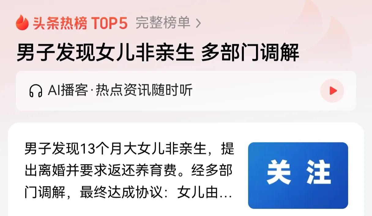 男子发现女儿非亲生,正常来说男的是受害者吧!父爱白瞎了,还戴上帽子让人看了笑话! 如此简单的小事,多部门进场调解了,一顿操作猛如虎,最后的结果是男的受伤又添堵。双方离婚女儿归女方抚养,男方放弃讨要抚养费,本来男方是申请讨要抚养费的,完全是调节了个寂寞呀,为什么要偏向过错方呢?这是变相鼓励过错方啊。男方抚养费和感情都白白付出了,连个精神赔偿都没有,这叫什么事儿啊! 男子发现女儿非亲生 多部门调解
