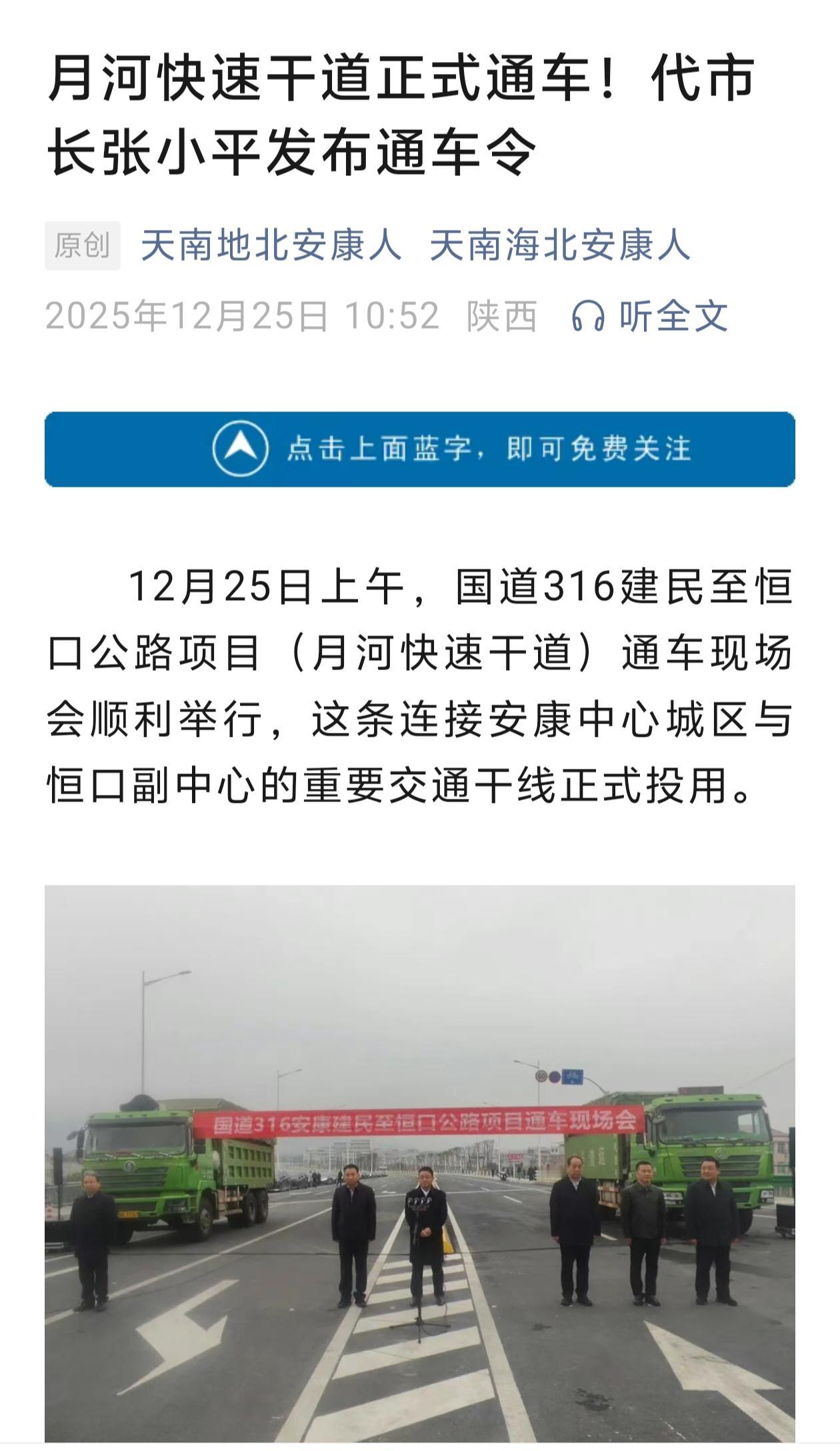 月河快速干道即316国道过境线正式通车,全长24公里,双向四车道带辅道,几乎是高速路标准,从安康高速客运站高速引线上新国道,20分钟可到达恒口镇,沿线居民可以摆脱堵车烦恼了,老316国道压力减轻了,这个春节一定更畅通。
