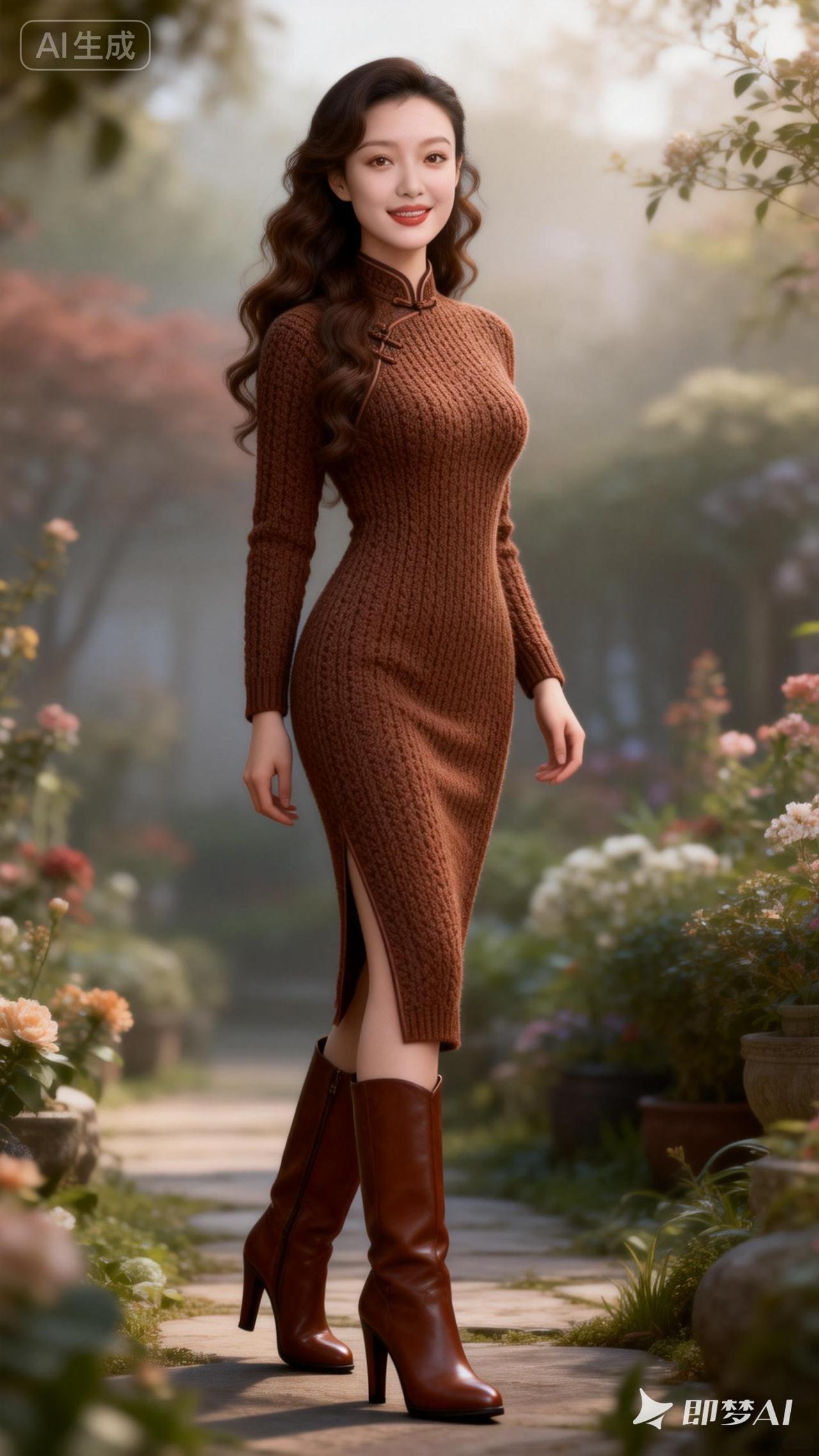优雅复古风,棕色针织连衣裙搭配高跟靴,尽显时尚魅力!👗👢