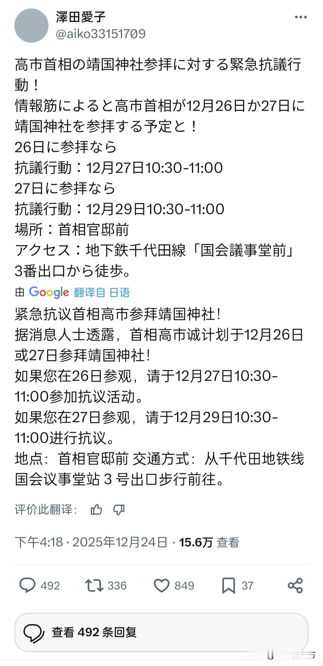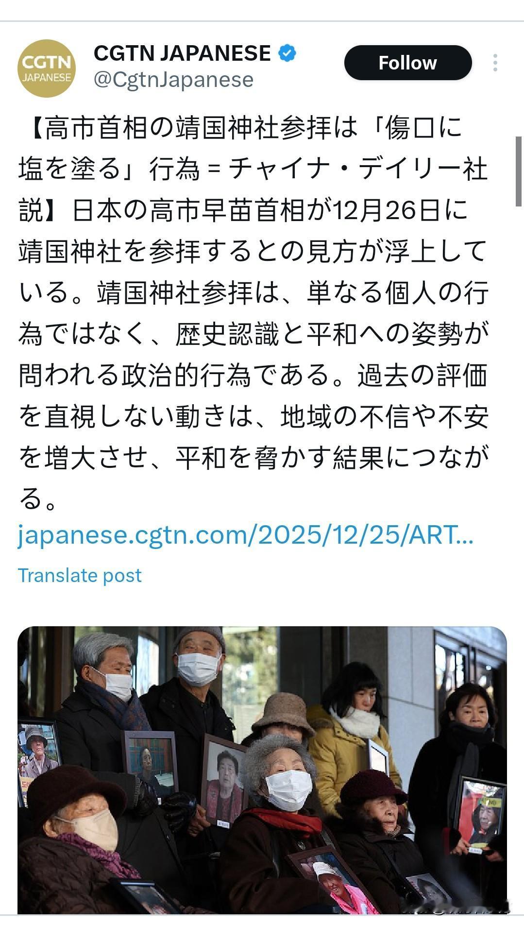 多方渠道报道高市早苗将在12月26日参拜鬼社。CGTN是中国国际电视台,隶属于央视。