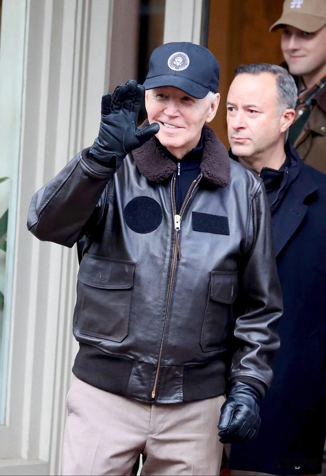拜登.穿着皮夹克戴着皮手套像认出他的人招手。