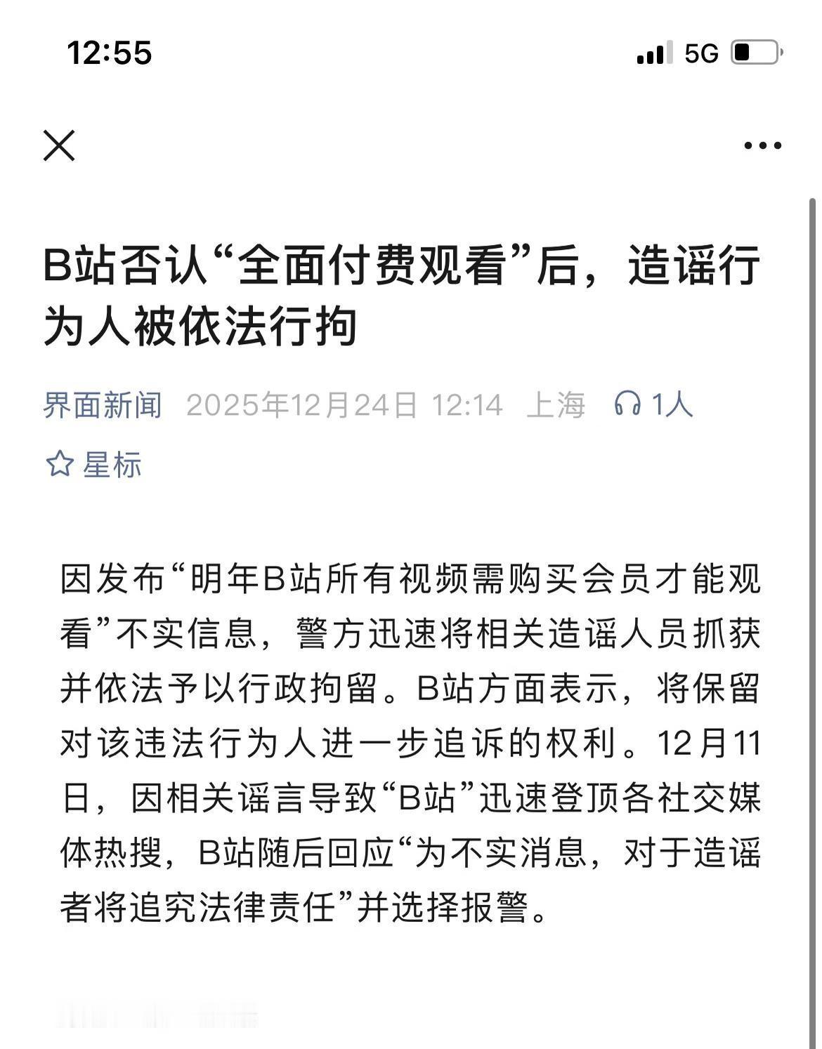 不惯着了!造谣“B站视频全面收费”者被拘 12月24日,据媒体报道:宣称“B站明年所有视频需购买会员才能观看”的造谣者,已被警方依法处以行政拘留。B站方面也明确表示,将保留对该违法行为人进一步追诉的权利。 这场风波的源头,不过是一条聊天记录加一张AI伪造的公告。这类内容生产门槛极低,但是由于涉及到大厂重大业务调整,能快速引发网友关注。 造谣一张嘴,辟谣跑断腿!从B站紧急回应、果断报警,到锁定违法人员,背后耗费了太多的人力与资源,辟谣成本远超造谣成本。 但是保护营商环境,可不是说说而已。若低成本造谣被肆意复制,企业将被迫耗费大量人力财力应对谣言,拖累正常运营进程。 从这次造谣者被拘可以看出,我们国家对网络谣言保持了零容忍的态度:网络不是法外之地,造谣传谣必受惩处。